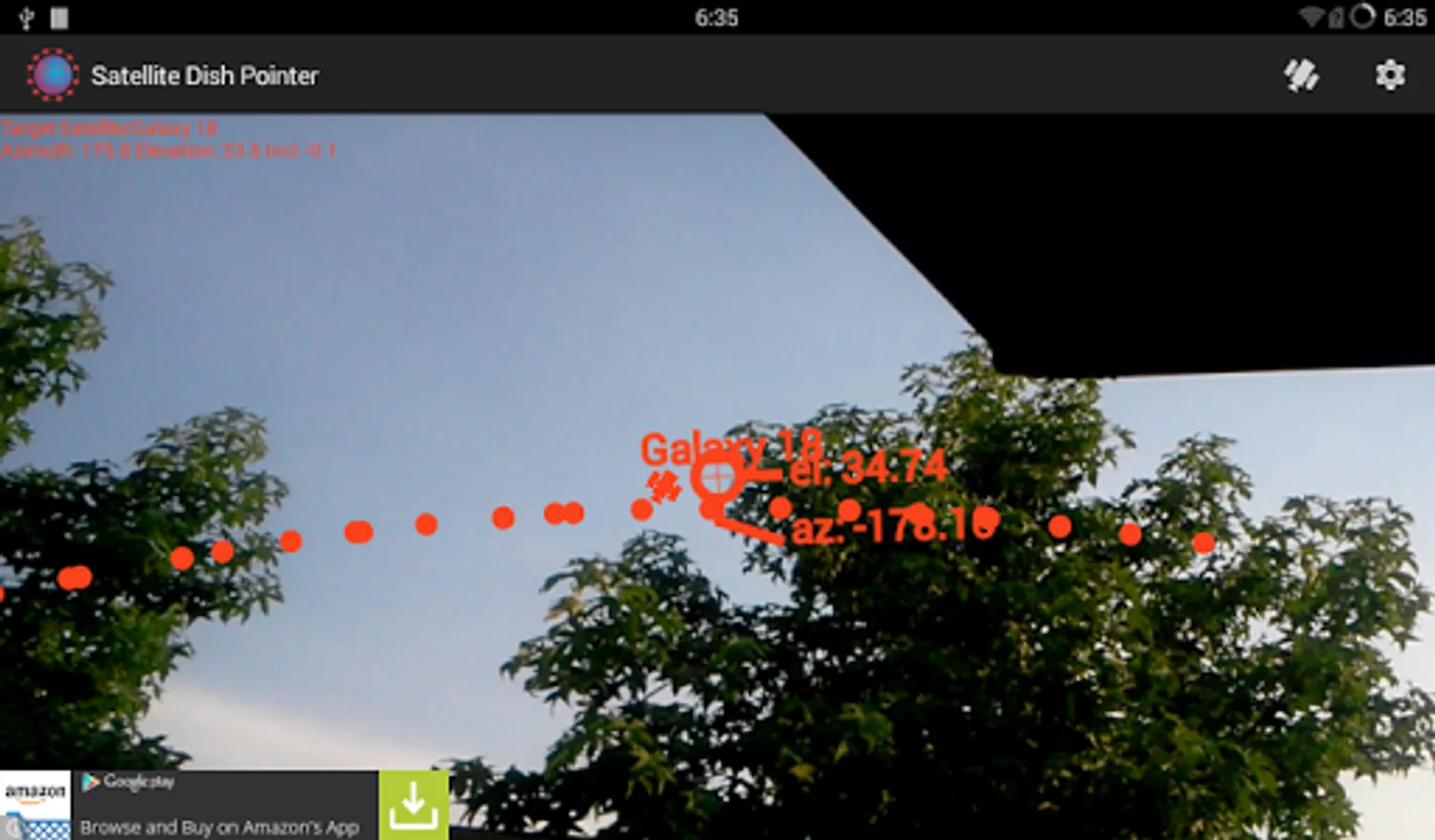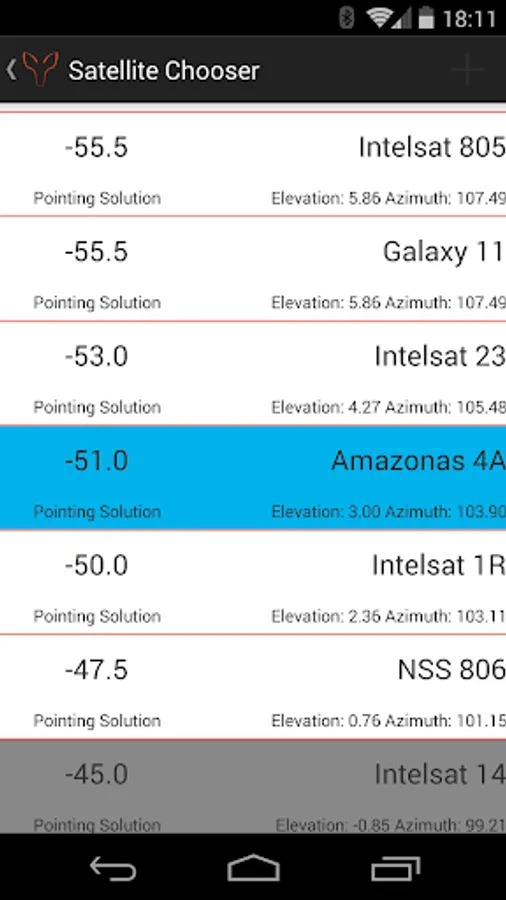 Satellite Dish Pointer comes with a user customizable list of over 230 geosynchronous satellites and has a very simple and intuitive display to guide you to where the satellite is in the sky.