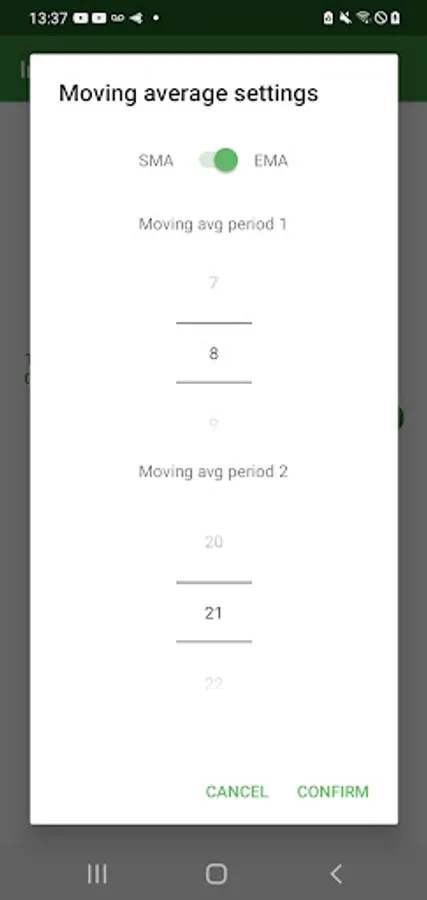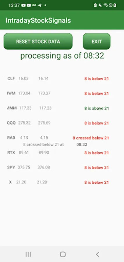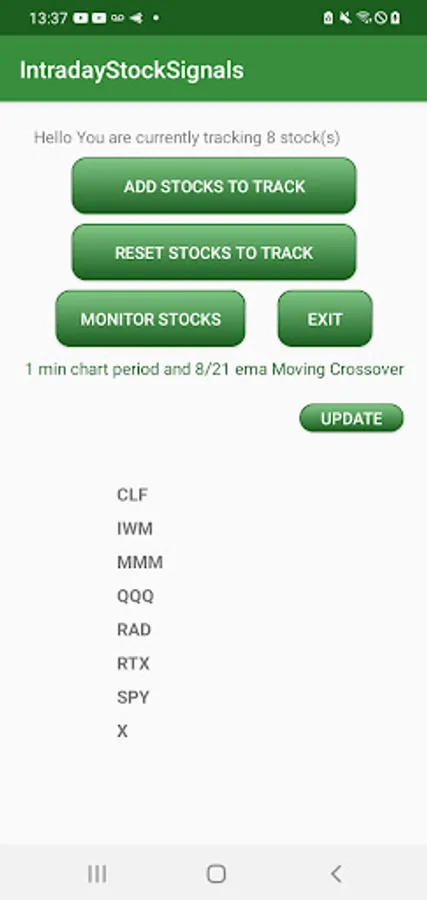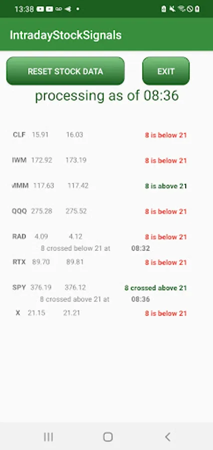 As a user, you can select what type of moving average (simple or exponential) and which two time periods to track on a 1-minute stock chart. The app will alert you for moving average crossovers and indicate if the 1st (shorter time frame) moving average is above or below the 2nd (longer time frame) moving average