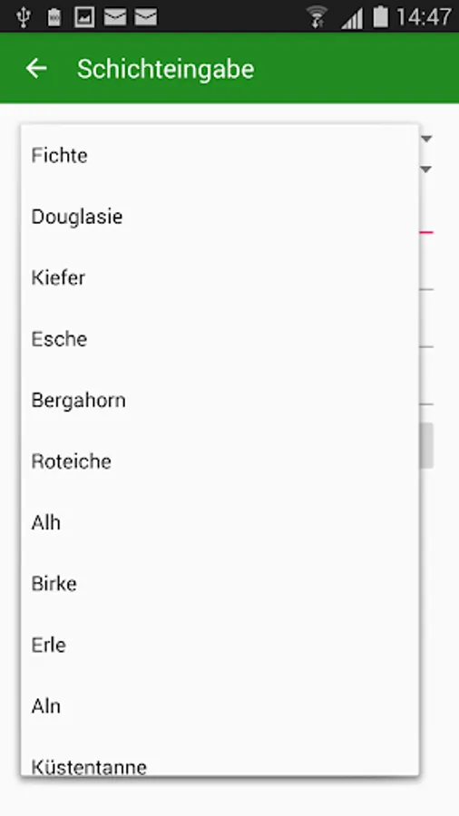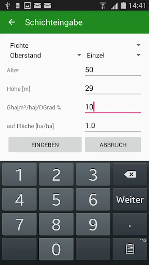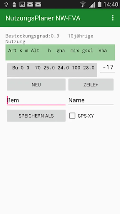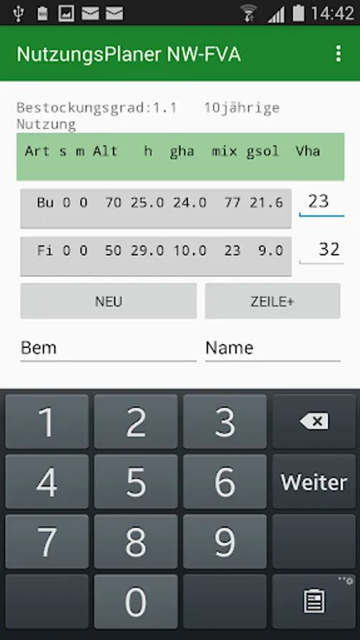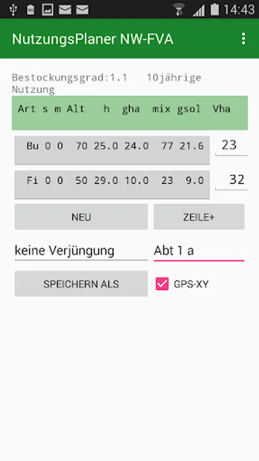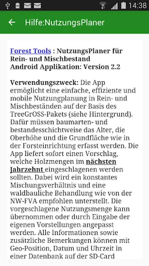 An example will illustrate the application: In a 70-year-old beech-spruce mixed stand covers an area of 24 m² / ha and a top height of 25m was measured for the beech. For spruce, the corresponding values were 10 m² / ha and 29m. First, the app user selects the button again, so that all old data will be deleted. He then presses the "Row +" and enters the mask to enter the tree species. He then enters the appropriate values. He has thereby also the possibility of the respective layer and blend shape hold. After each entry will appear on the main screen is a row for the input tree. For the missing spruce the App user repeats the process. With each new inventory line of the mixing ratio, the stocking and the proposed usage amount are recalculated. In the example, the stock has a stocking of 1.1 and it should be 47 m³ / ha beech and 29 m³ / ha Spruce be removed. The values are based on the assumption that the mixing ratio is kept constant. The user can also modify and delete, by clicking on them again entered the tree species line. Are all stock lines detected, so the proposed usage amount can either be accepted or changed interactively own estimation. The values can use the button "save as" to be stored in the SQLite database the app, which is located in the directory "/ fTools" on the sdcard named "nutzungsplaner.db". The database file can eventually be transferred to your own PC and processed with other programs via email, a cloud (Dropbox, OwnCloud) or a data cable. For the inspection and handling of SQLite file especially the free Firefox add-on SQLite Manager is recommended. With the Option button the option menu can be activated at any time, whether it be to the Help call or to end the active app.
