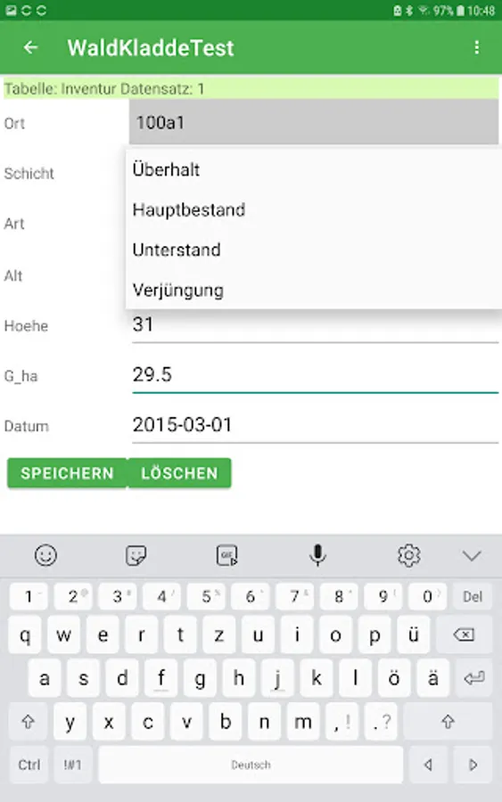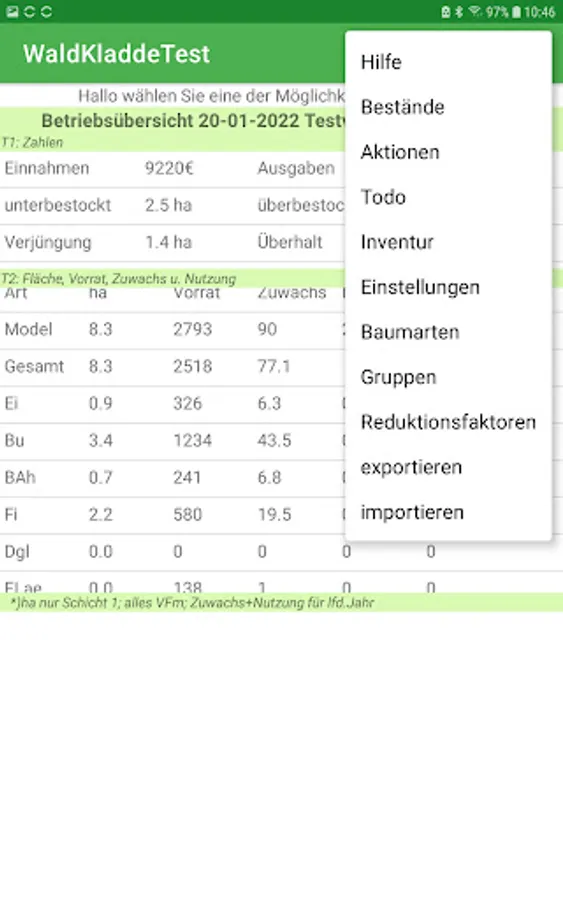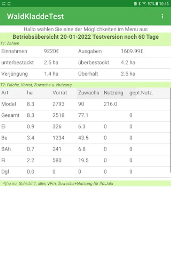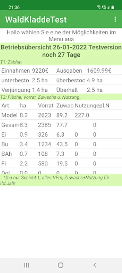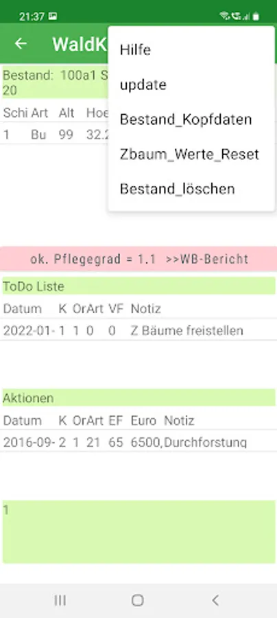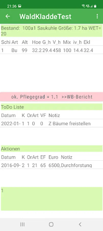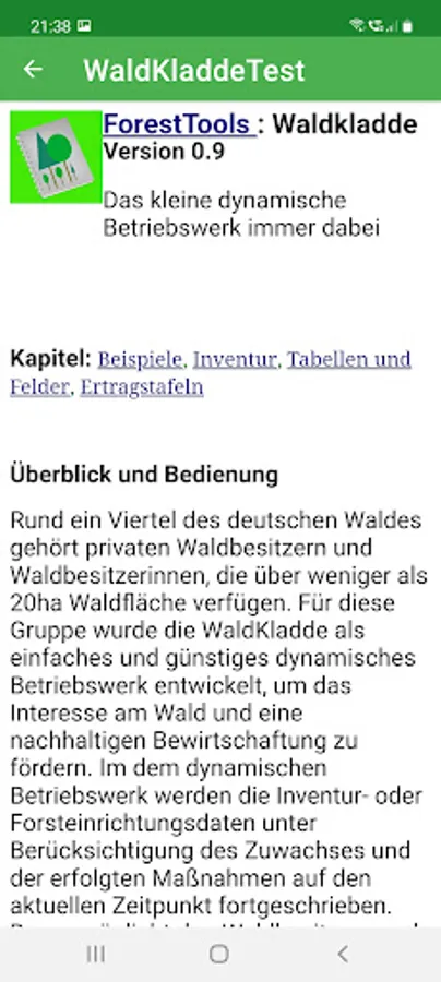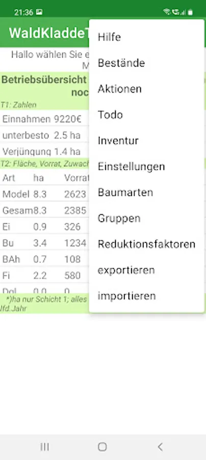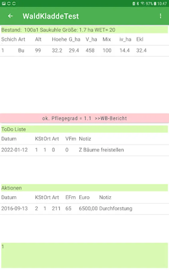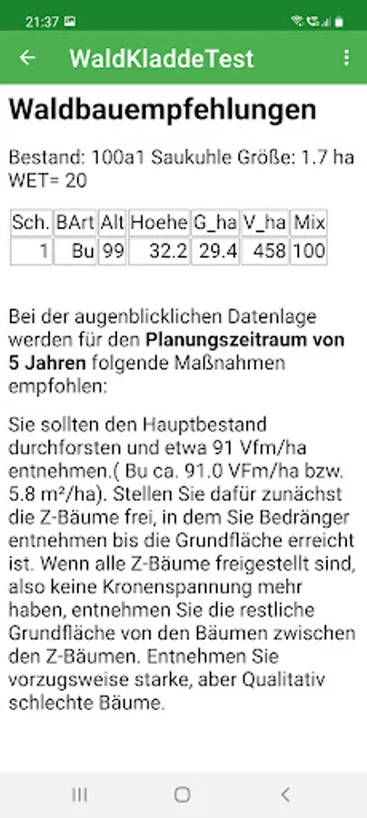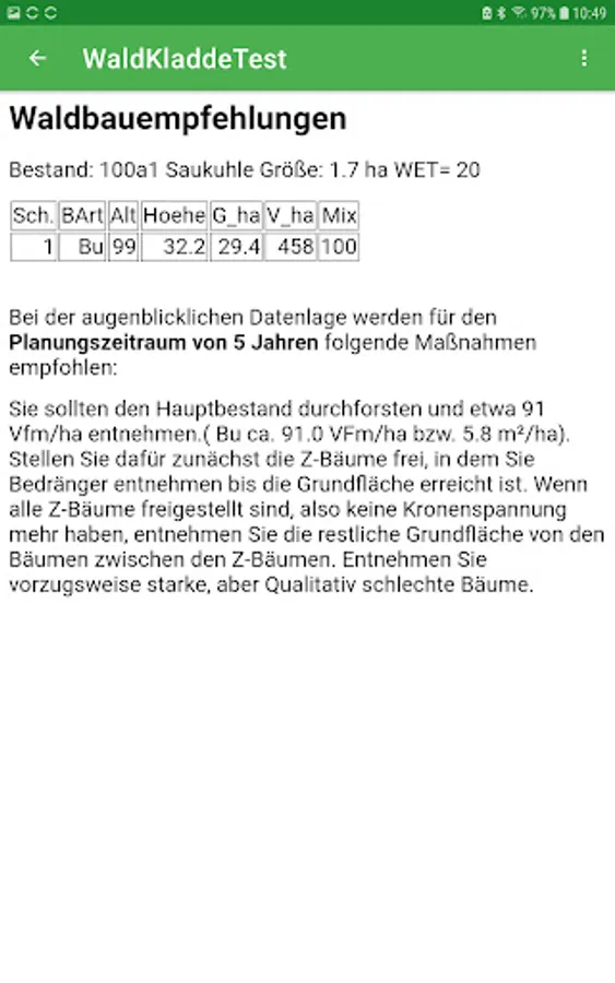 Around a quarter of the German forest belongs to private forest owners who have less than 20 hectares of forest at their disposal. The Waldkladde was developed for this group as a simple and inexpensive tool to promote interest in the forest and sustainable management. In the dynamic depot, the inventory or forest management data are updated to the current point in time, taking into account growth and the measures taken. This enables forest owners to have an up-to-date overview of their operations. In addition, you will be informed of necessary silvicultural measures and thinning interventions with suggestions for the removal quantities.