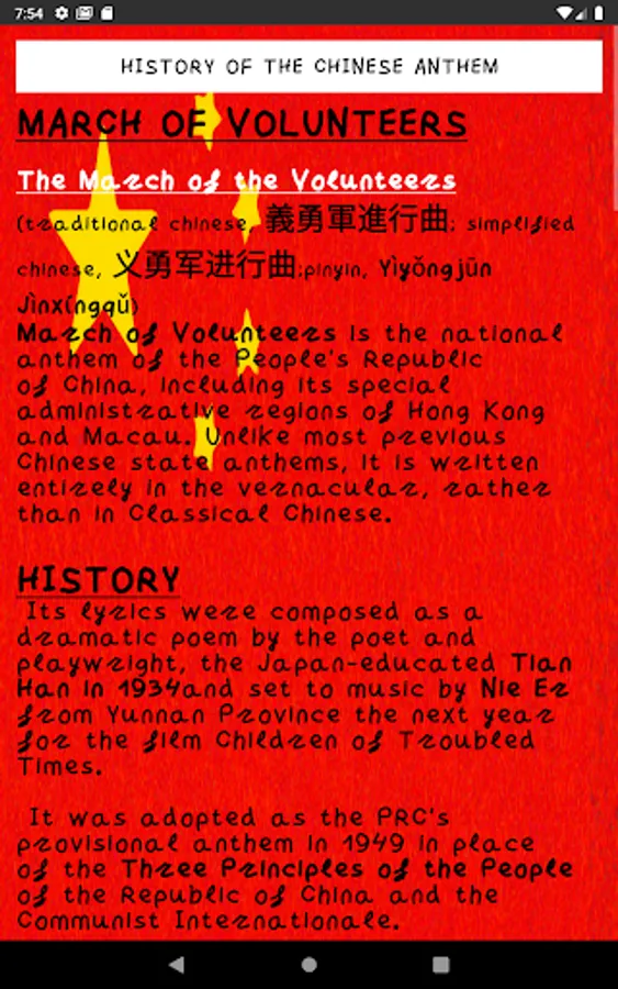 Anthem China is a simple Android application with which you can listen to the Chinese anthem anytime, anywhere.