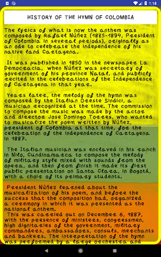 Anthem Colombia is a simple Android application with which you can listen to the Colombian anthem anytime, anywhere.