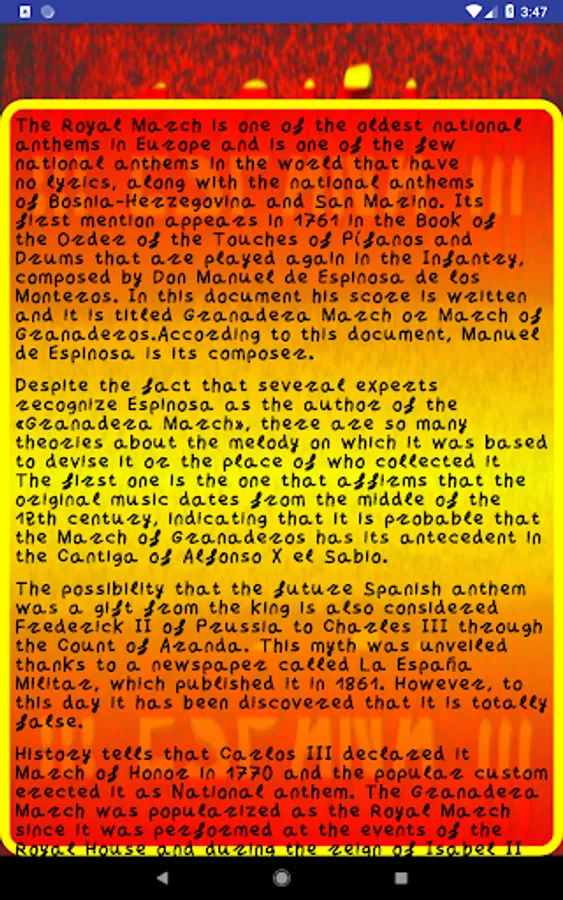 Anthem Spain is a simple Android application with which you can listen to the hymn of Spain anytime, anywhere.