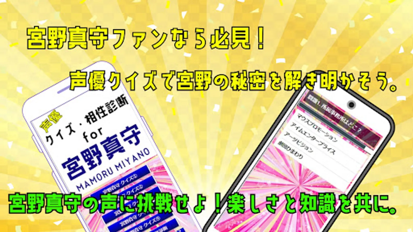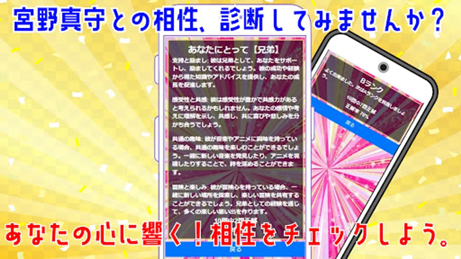 This is a quiz/compatibility diagnosis app about the popular voice actor "Mamoru Miyano".