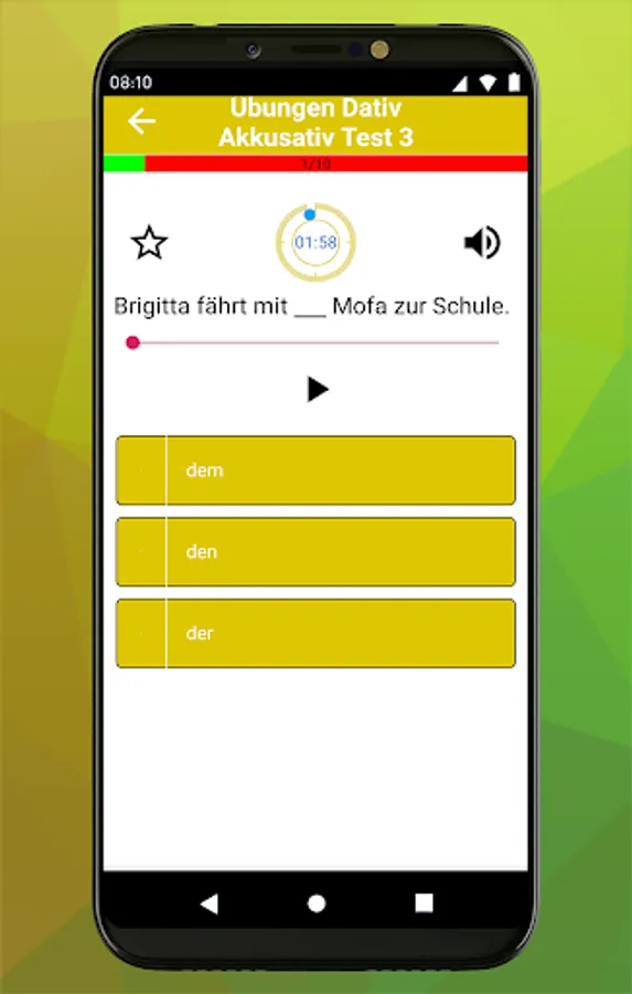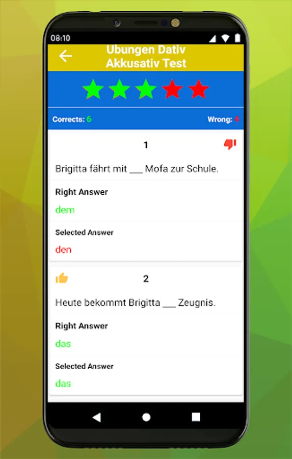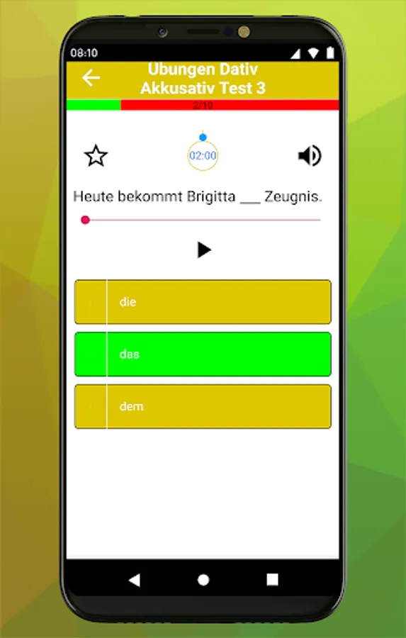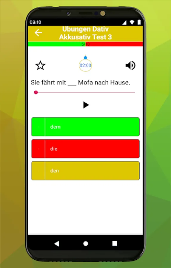Through our exercises dative or accusative you improve the grammar and the vocabulary in the language level A1 A2 B1 B2.