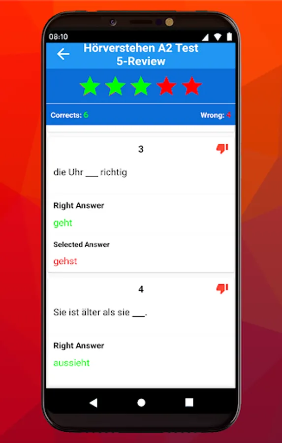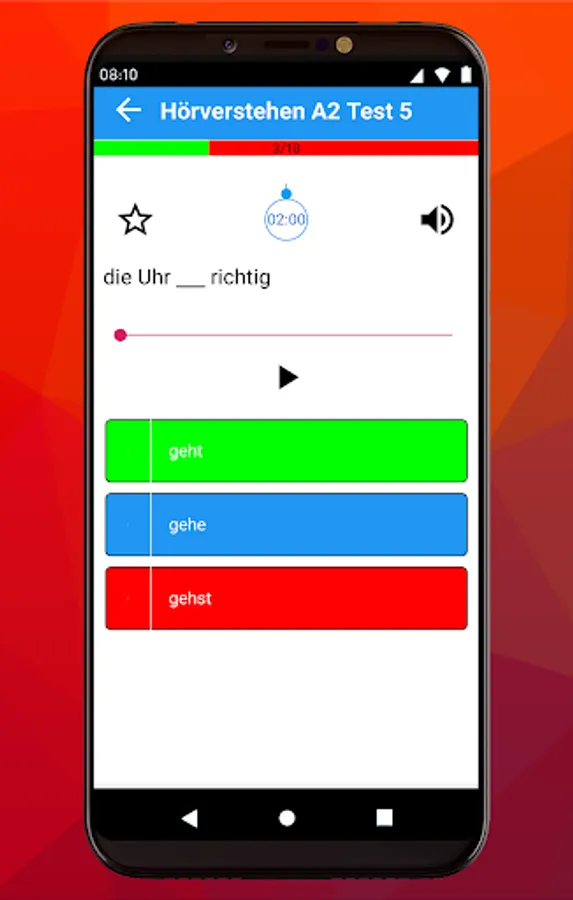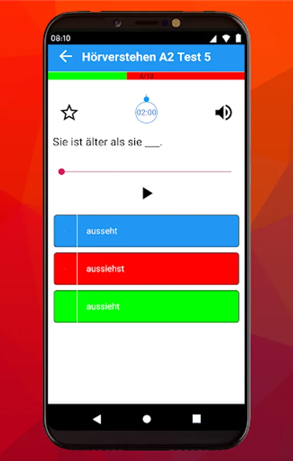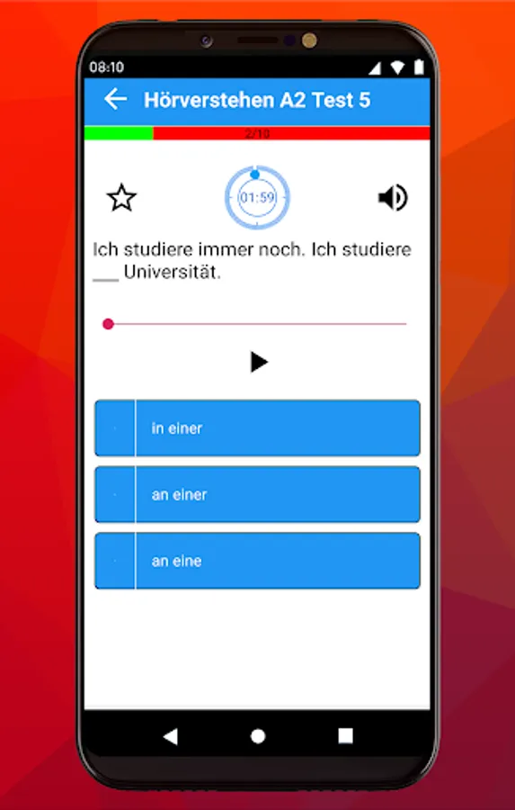 In this app you will find extensive exercises that put your German listening skills to the test. You can find even more audio texts in the app "Listening exercises A2" Listen to German.