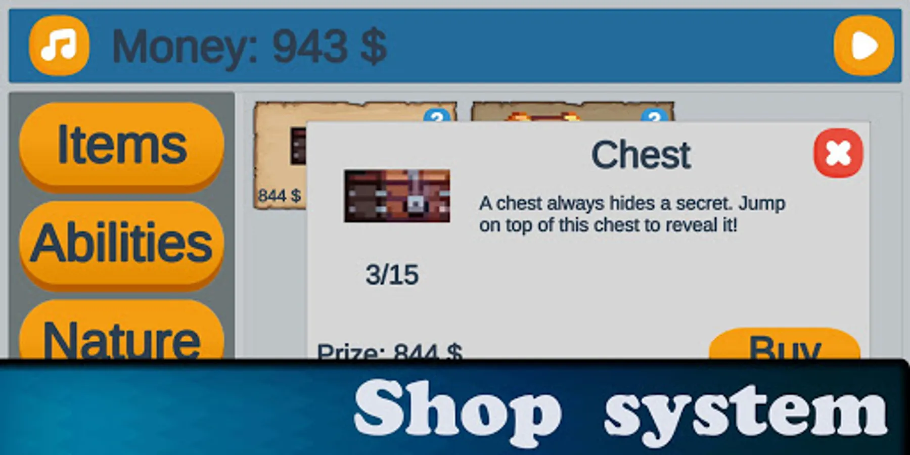 A satisfying 2D Jump’n’Run where you have to collect as many coins and gems as possible. With the money you can buy more items to get more money and so on! It’s a never ending loop of buying and collecting.