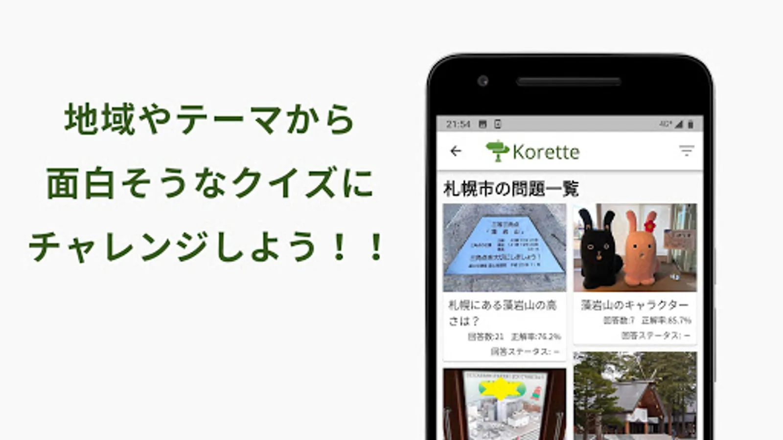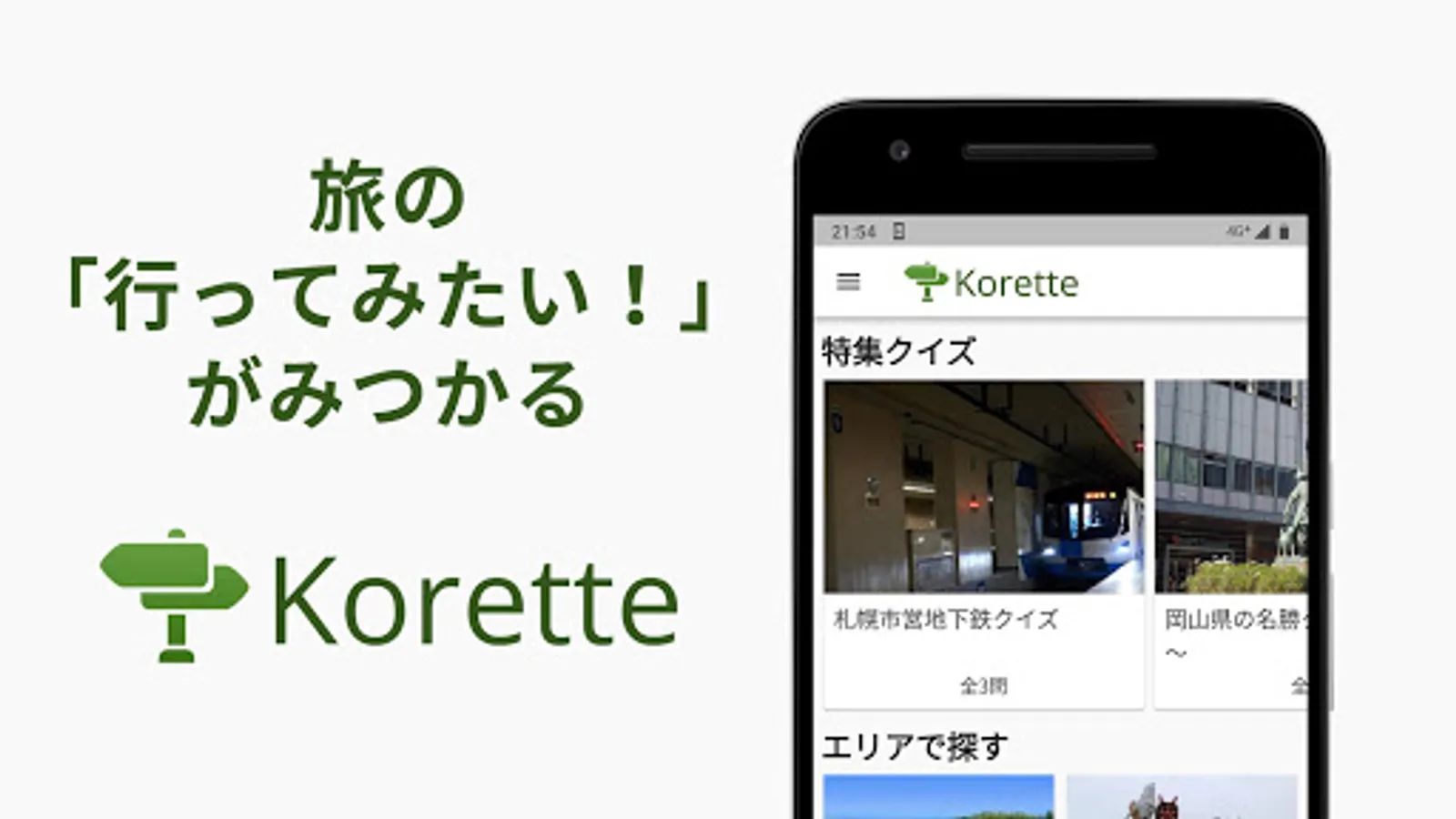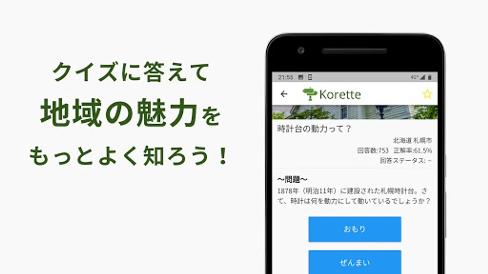 気軽に楽しくクイズに答えるだけで、観光地や地域の隠れた魅力をみつけることができるWebサービス「Korette(https://korette.fun)」のアプリ版です。
