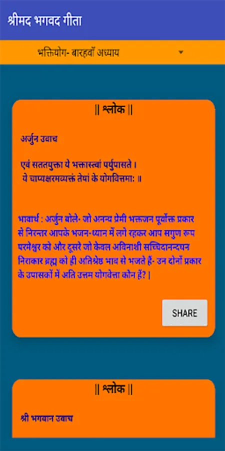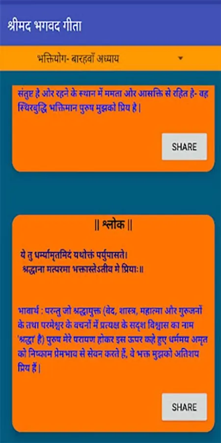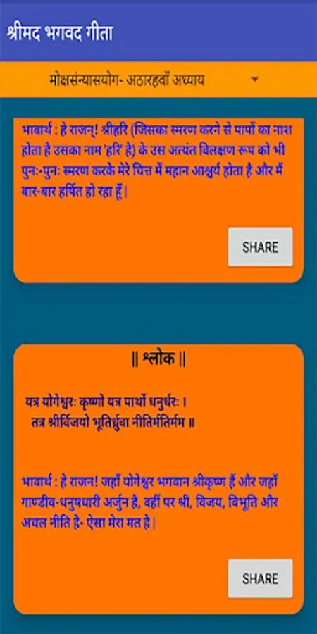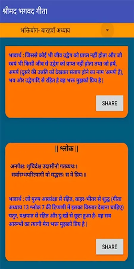 Looking for a an app that can help you to read all the chapters of Shrimad Bhagwad Geeta, then this app will help you for sure. It contains sloks of all chapters with meaning in Hindi. Read regularly to enhance daily life living with values. Shrimad Bhagwad Geeta are the preaching of Lord Krishna to Warrior Arjun during Mahabharat War. Not only these preaching helped Arjun and his team to win the Mahabharat war but today, it helps common man to live a life with values. Shrimad Bhagwad geeta can be truely a helpful tool for especially students who are going through deep depression. It can help to overcome such depression. It can help to live a peacefull happy and healthy life.