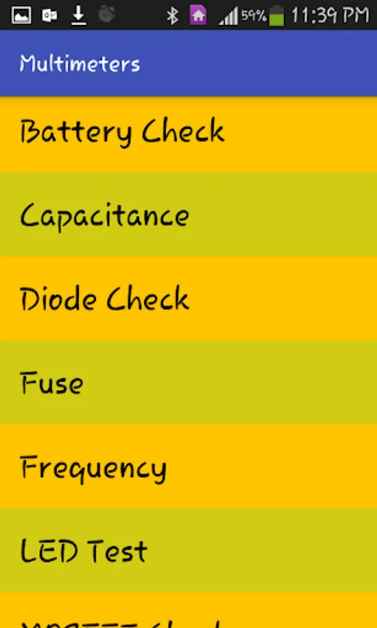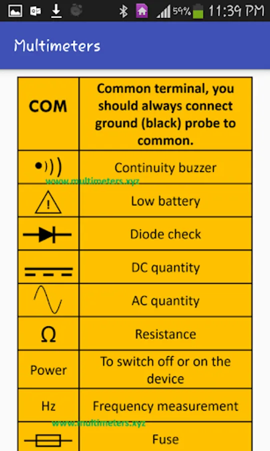 Multimeters are the electronic measurement tools which help you to measure basic electrical quantities such as voltage, current and resistance. In other words, a multimeter is a combination of the voltmeter, ammeter and ohmmeter. Modern digital multimeters are loaded with multiple features such as capacitance measurement, temperature measurement, continuity tests, transistor working, battery testing, and diode checking. Keeping all these points and electrical industry in view this app is designed to give you the information about working of the meter. After going through this application you'll learn about the basic theory of multimeters as well as you'll be able to use your device for performing different calculations.