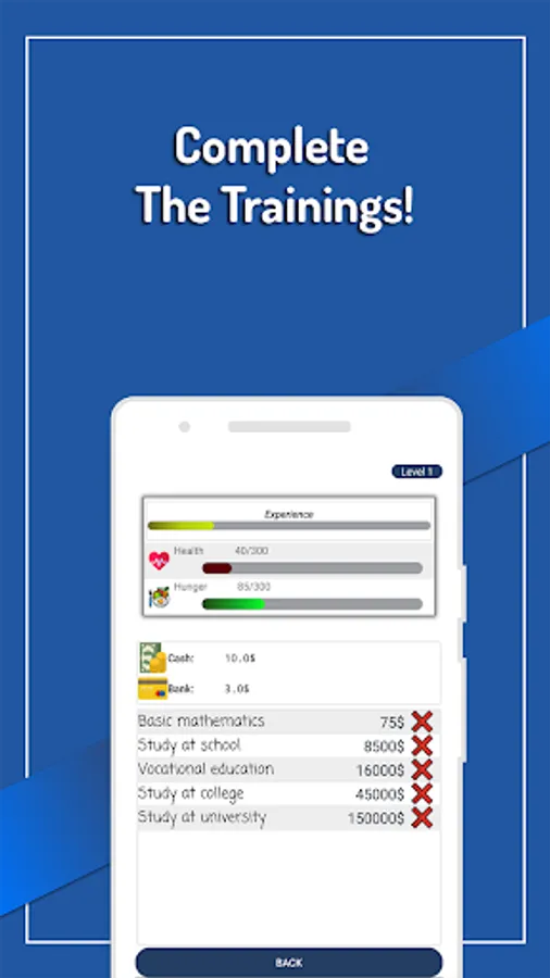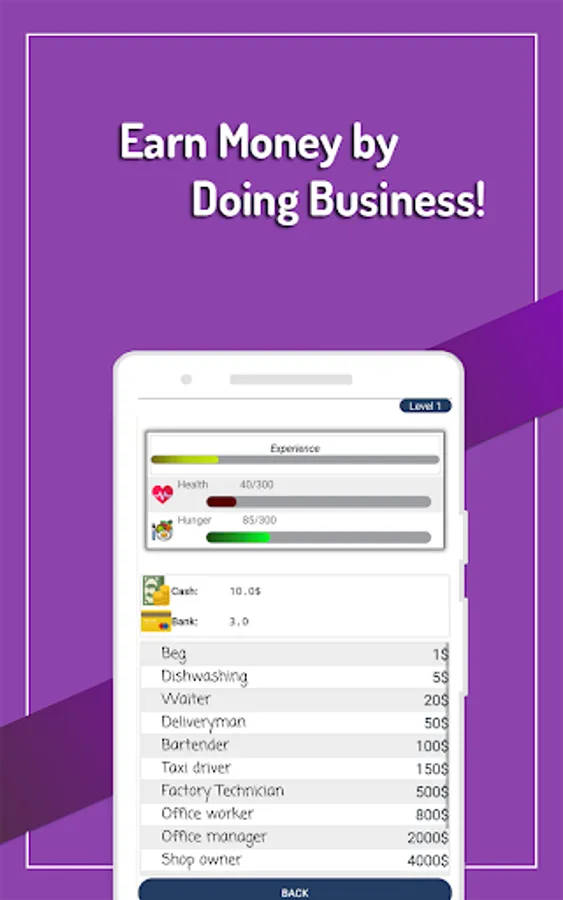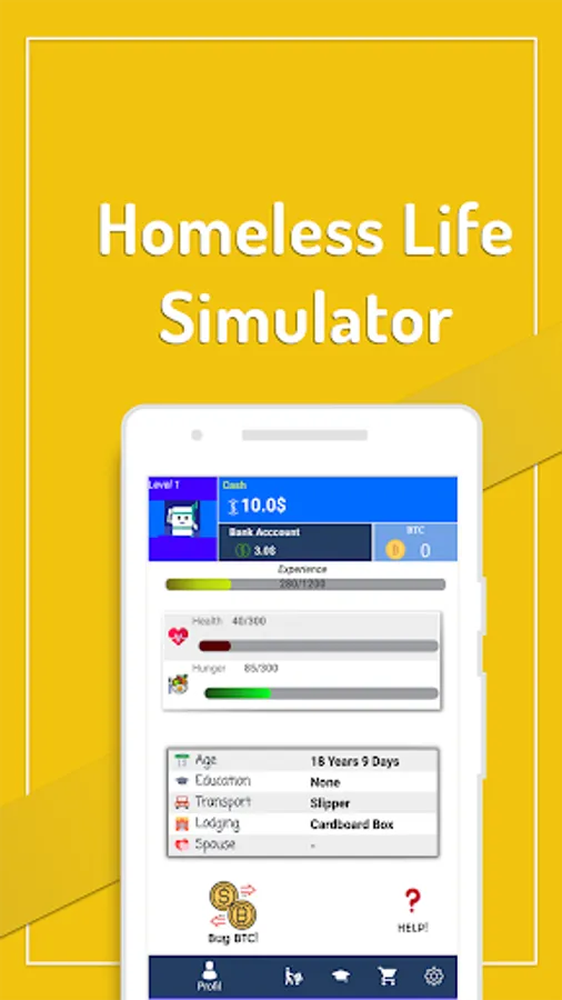 When you start playing, you play an unskilled homeless person who has no money in his pocket.