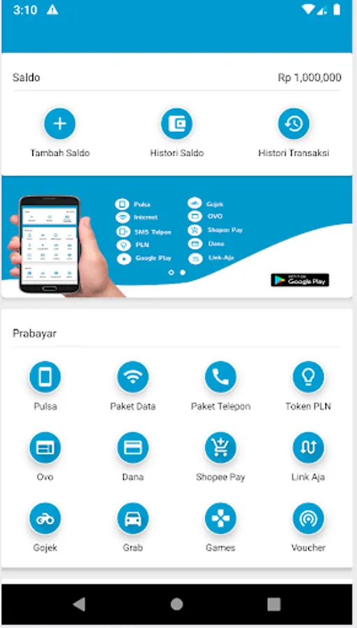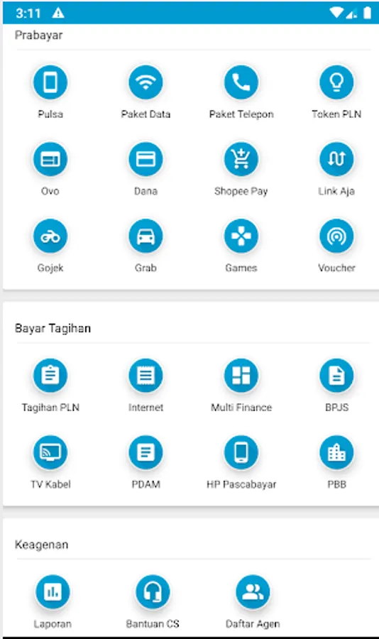 Prepaid Telkomsel Credit, Prepaid Indosat Credit, Indosat Ooredoo Prepaid Credit, Prepaid XL Credit, Prepaid Tri Credit, Prepaid Smartfren Credit, Prepaid Axis Credit, Postpaid Halo Card Credit, Postpaid Smartfren Credit, Postpaid Indosat Ooredoo Credit, Telkomsel Data Packages, Indosat Data Packages Ooredoo, XL Data Package, Tri Data Package, Smartfren Data Package, Axis Data Package, Selelur Postpaid, Electricity Bill, Electricity Token,