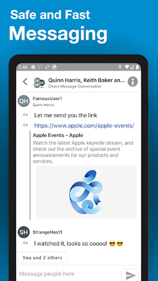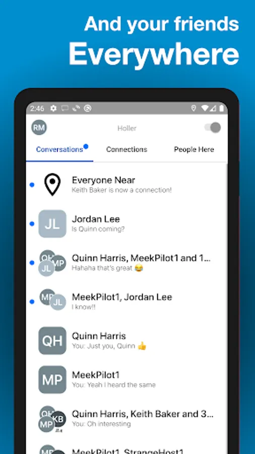 Holler puts you into instant contact with the people here now - safely and securely. Share messages, links, content and more with a single tap. Oh, and it will handle all your other messaging needs too. Easy. Simple. Holler.