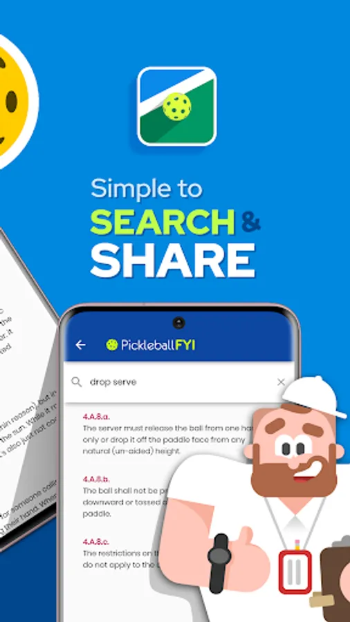 Pickleball FYI is your pocket guide to everything pickleball. Including organized and searchable rules, frequently asked questions, etiquette, and even drills! Now with automatic yearly pickleball rule updates!