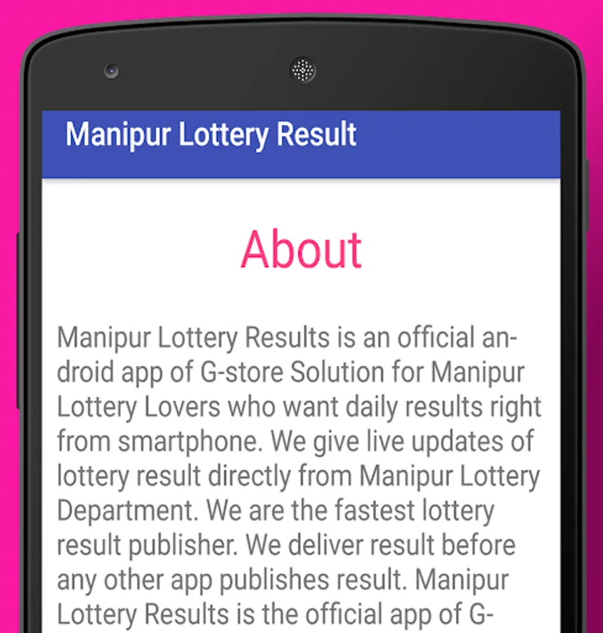 We publish daily Manipur lottery result. It is an android app from G-store Solution for who want daily results right from smartphone. We give live updates of result directly. We are the fastest publisher. We deliver result before any other app publishes.