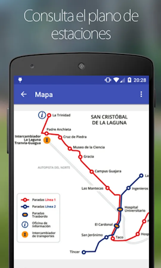 With this app you will know in real time how long it takes to reach your tram in Tenerife, marking only the source station and destination. Quick and easy. Schedules in real time provided by Metropolitano de Tenerife.