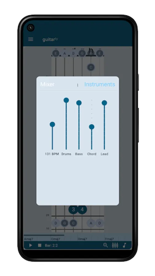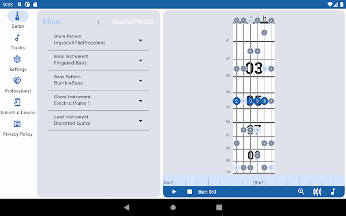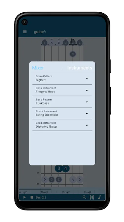Mix the track - choose the backing track then set the drum pattern, the accompanying instrument, the bass and the tempo. Turn off the bass if you’re practising bass or just leave the drums if you want a beat pattern.