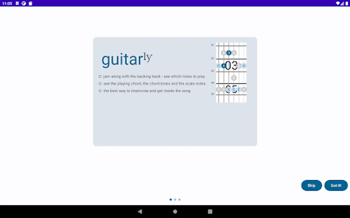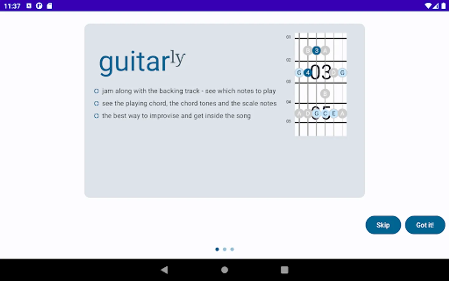 Beginner guitarists play along with the chord shapes shown. Advanced guitarists can pick alternative scales that the AI engine chooses to fit the chord. All guitarists just noodle along to bring back the fun to playing.