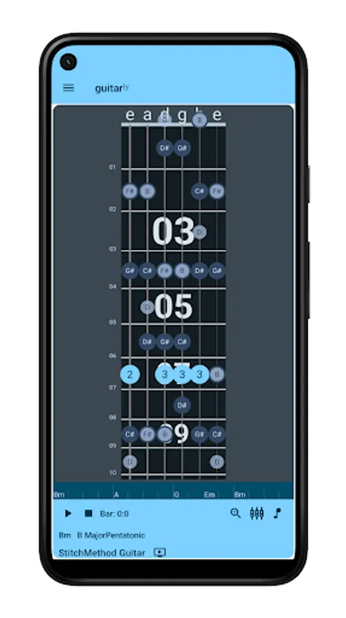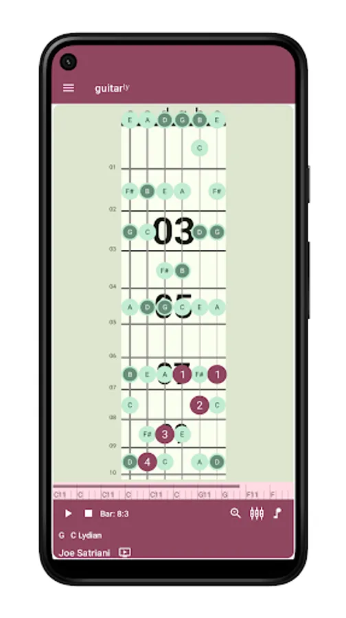 See which notes to play on the animated guitar graphic which changes as the chord changes. Pick your own scale from the scale selector which shows which scales work over the playing chord.