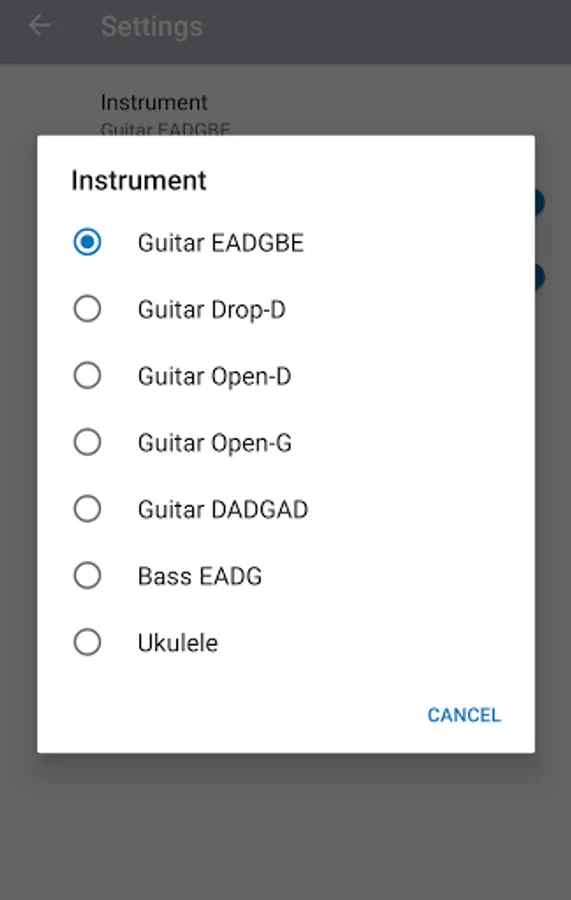 Choice of instrument includes guitar (standard tuning and Drop-D tuning), bass and ukulele.