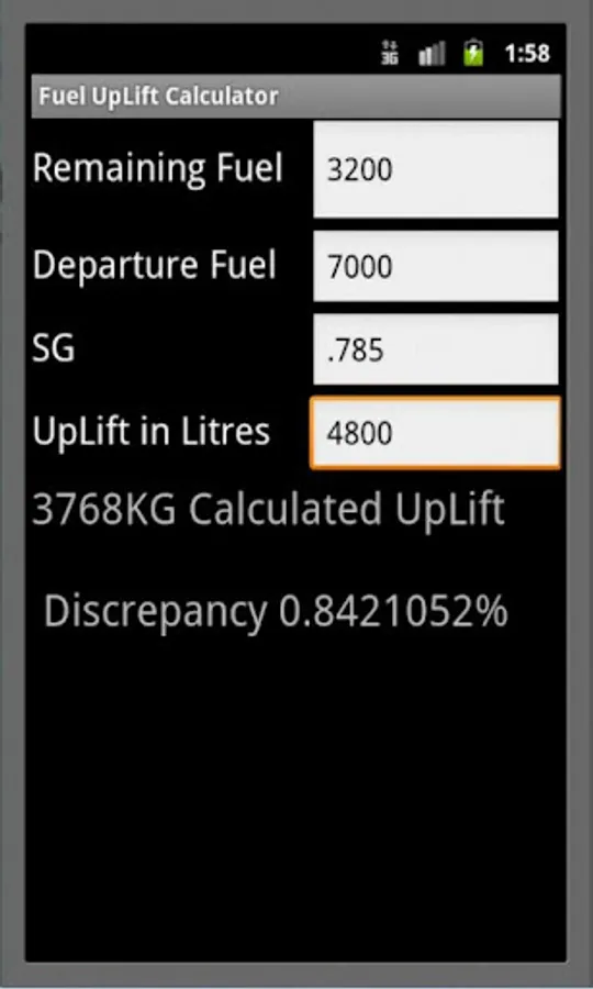 Aircraft Engineer fuel uplift calculator enter Remaining fuel,Departure Fuel, Specfic Gravity and Uplifted fuel in Litres. The app will calculate Uplifted fuel in KiloGrams and Error between Calculated uplift and actual uplift in percentage.