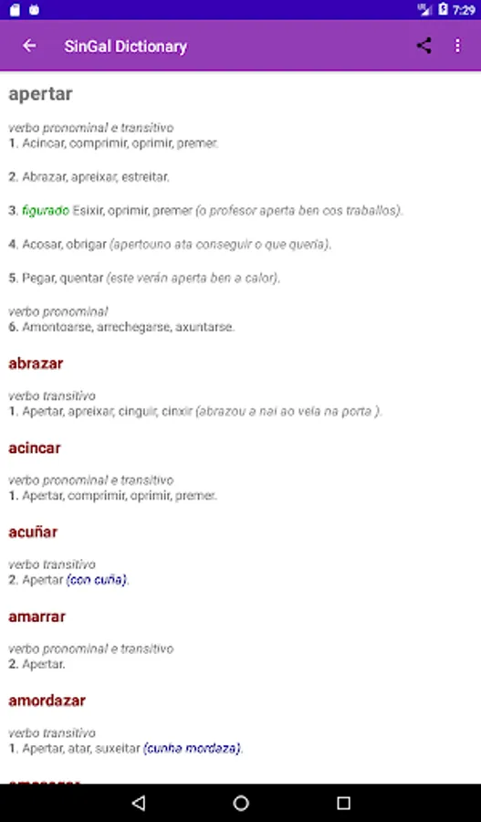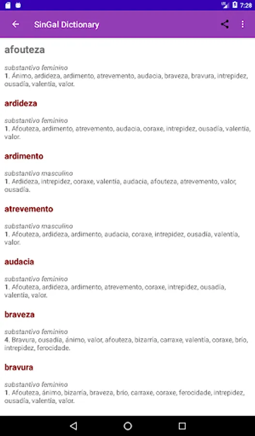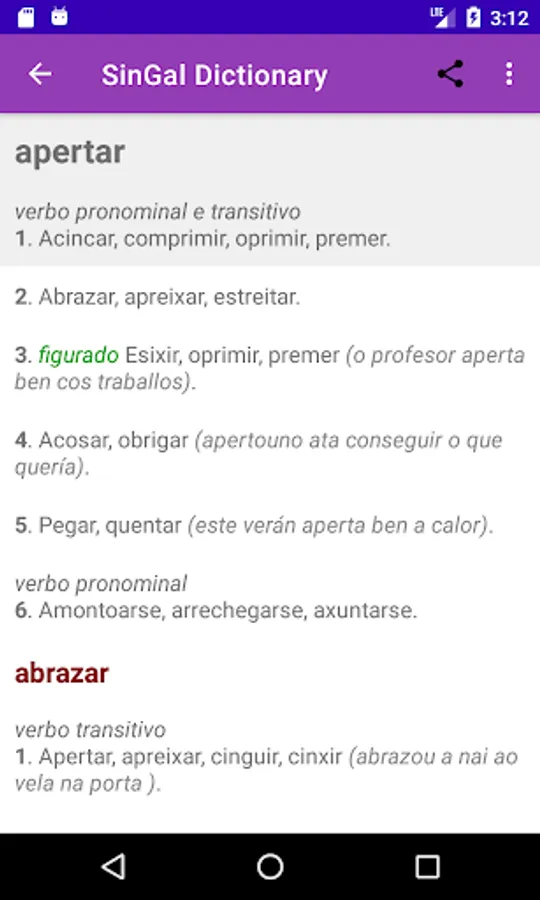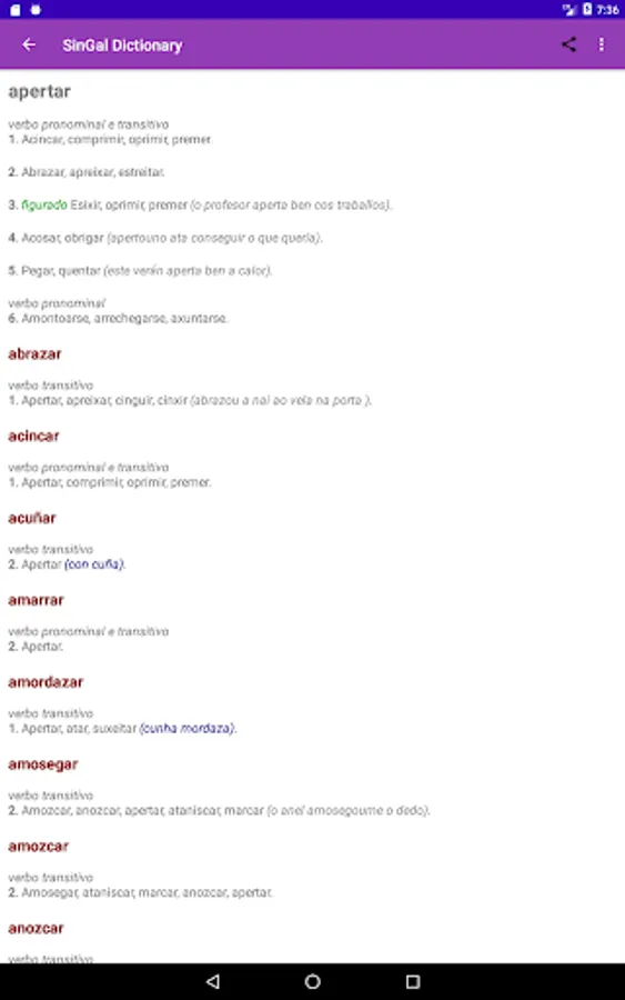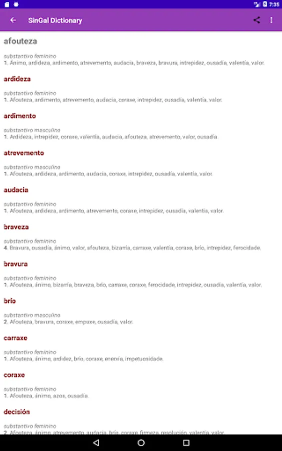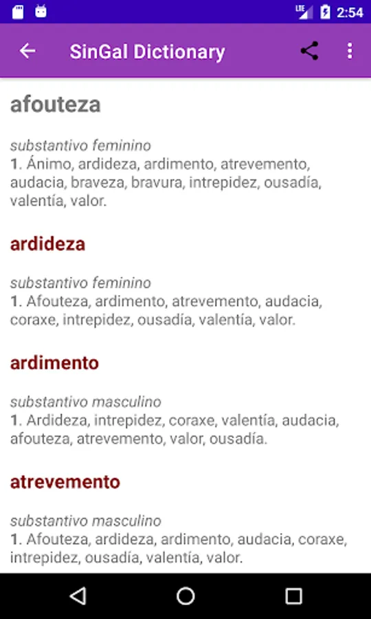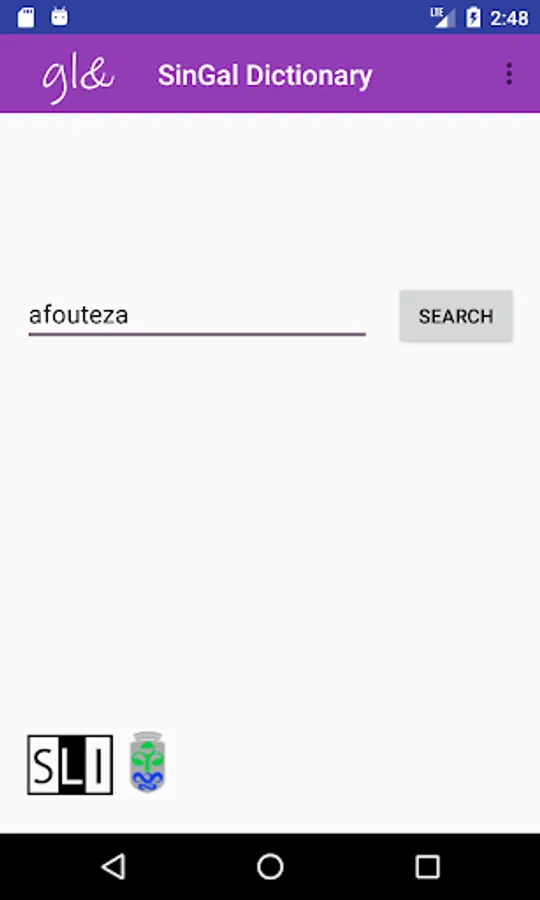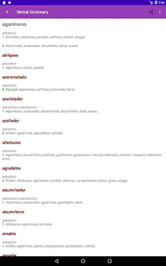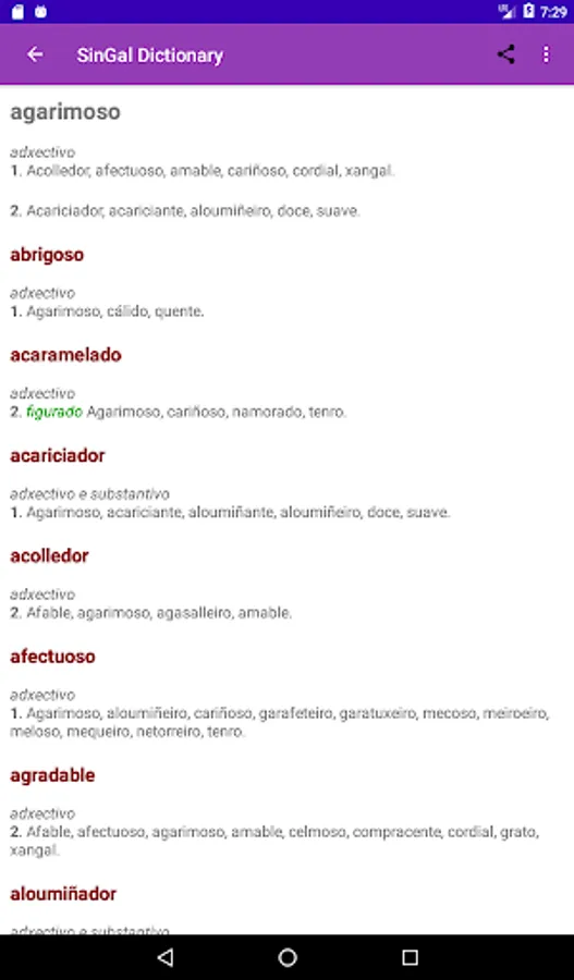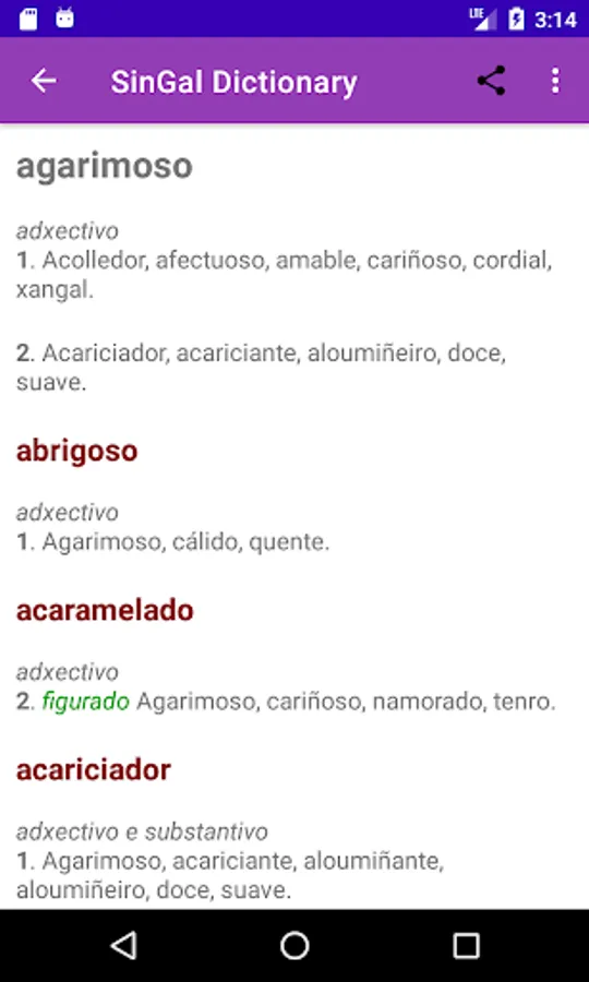 The SinGal Dictionary is the open-source offline mobile version of the Dicionario de Sinónimos do Galego (http://sli.uvigo.gal/singal/) elaborated by Xosé María Gómez Clemente, Xavier Gómez Guinovart and Alberto Simões (Vigo: Xerais, 2015) at the Seminario de Lingüística Informática of the University of Vigo (http://sli.uvigo.gal), where is freely available since 2013. This dictionary is the result of the revision, updating, enlargement and conversion to digital format of the Dicionario de Sinónimos da Lingua Galega (Vigo: Galaxia, 1997), already out of print, published under the coordination of Camiño Noia, Xosé María Gómez Clemente and Pedro Benavente, with the participation of Gonzalo Constela, Xosé Henrique Costas and Valentín Arias.