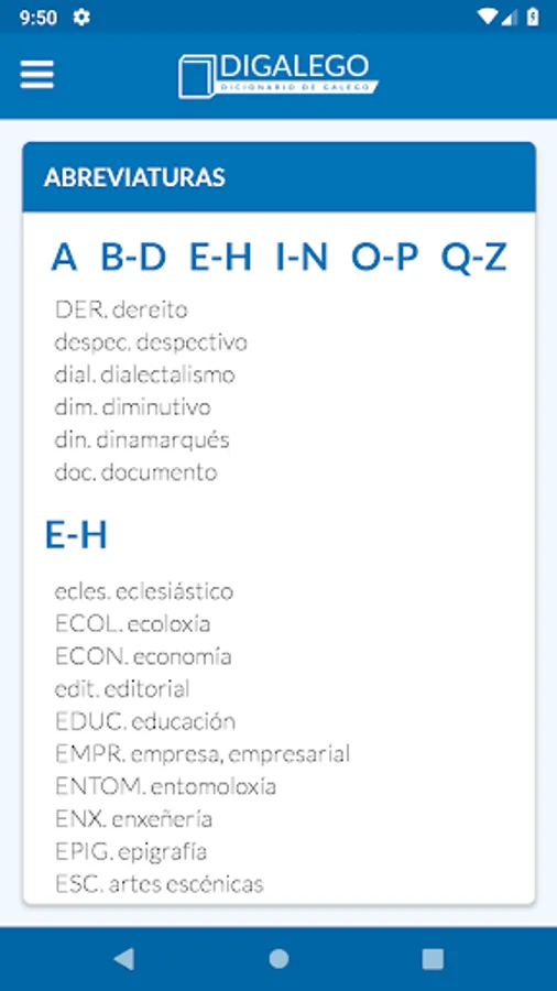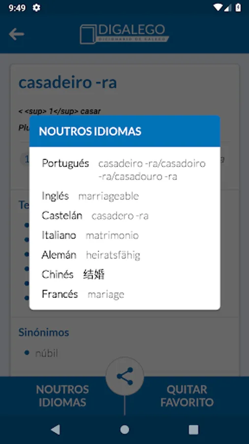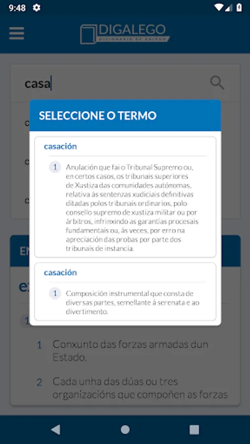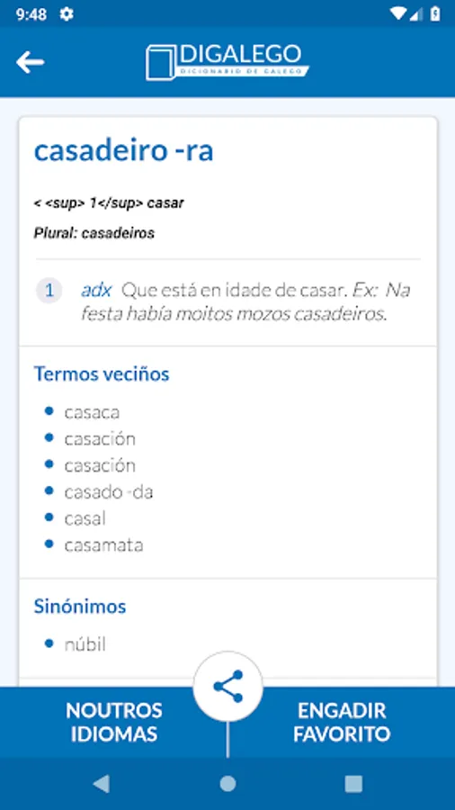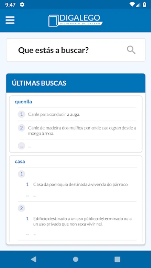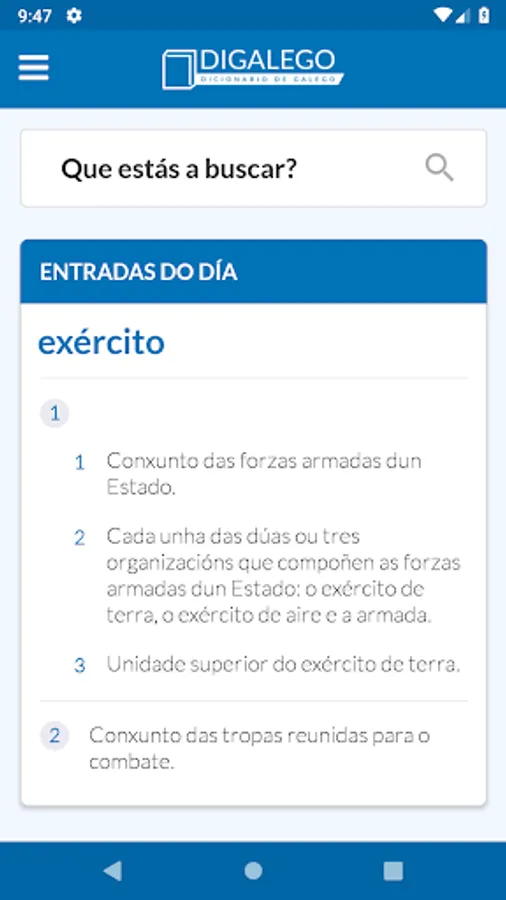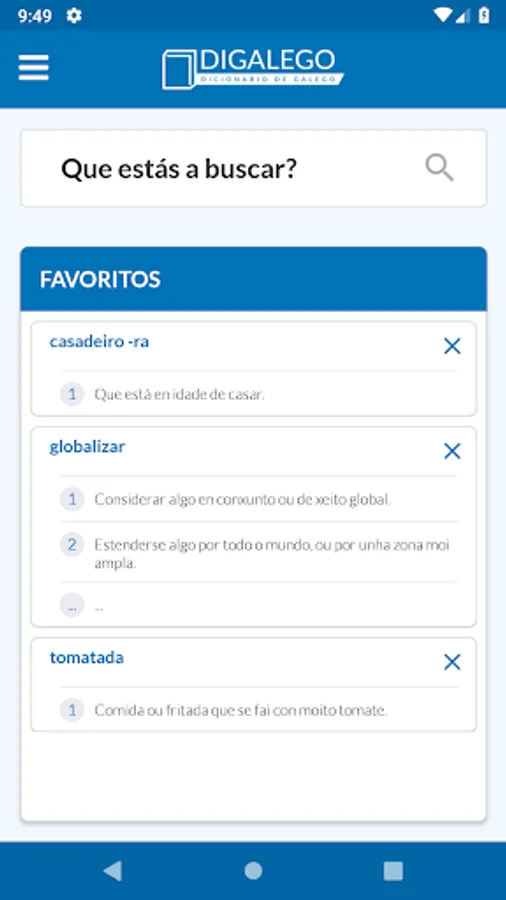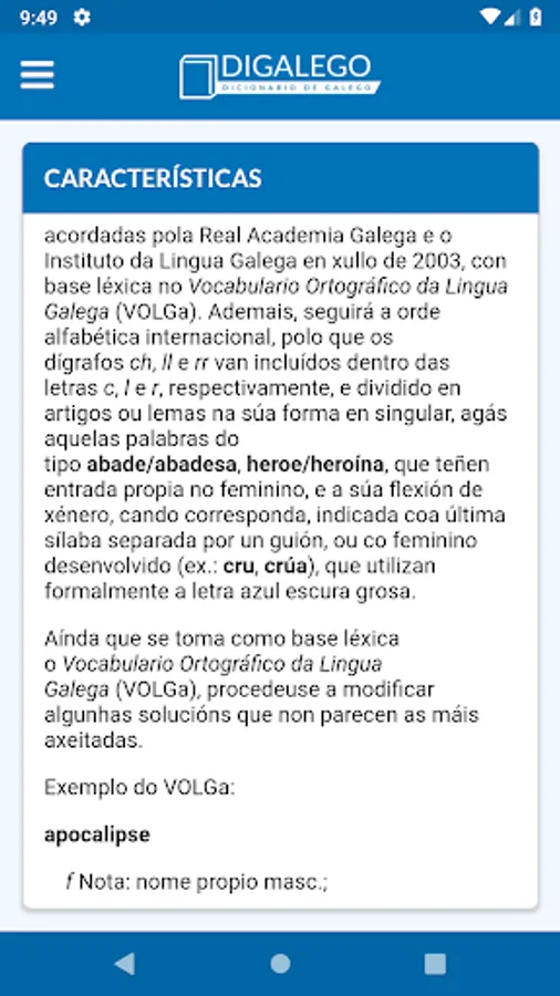 The application of Digalego, official app of the Xunta de Galicia, allows the search of terms in the Galician dictionary on the Internet, allowing access to its definition, associated multimedia resources, neighboring terms, synonyms, phrases made, etc.