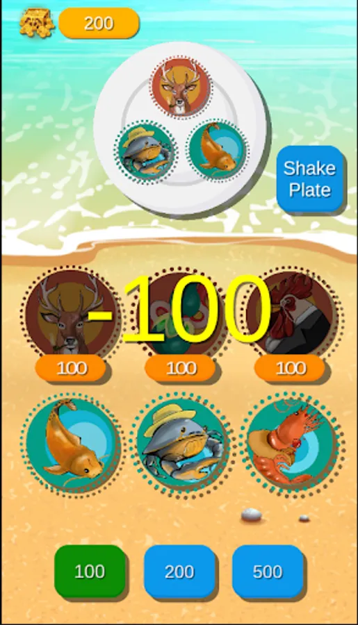 The six sides of the dice, instead of showing one to six pips, have pictures of a fish, a prawn, a crab, a rooster, a calabash gourd, and a stag. Players place wagers on a board that has the six pictures, betting on which pictures will appear. If one die corresponds with a bet, the bettor receives the same amount as their bet. If two dice correspond with a bet, the bettor receives two times their money. If three dice correspond with a bet, the bettor receives three times their money. For instance, if one were to place $1 on fish, and the dealer rolls 2 fish and 1 stag, then the better would receive $2 while keeping the $1 they had bet. Any money not rewarded for the round is kept in a central pool managed by the dealer, who rolls the dice.