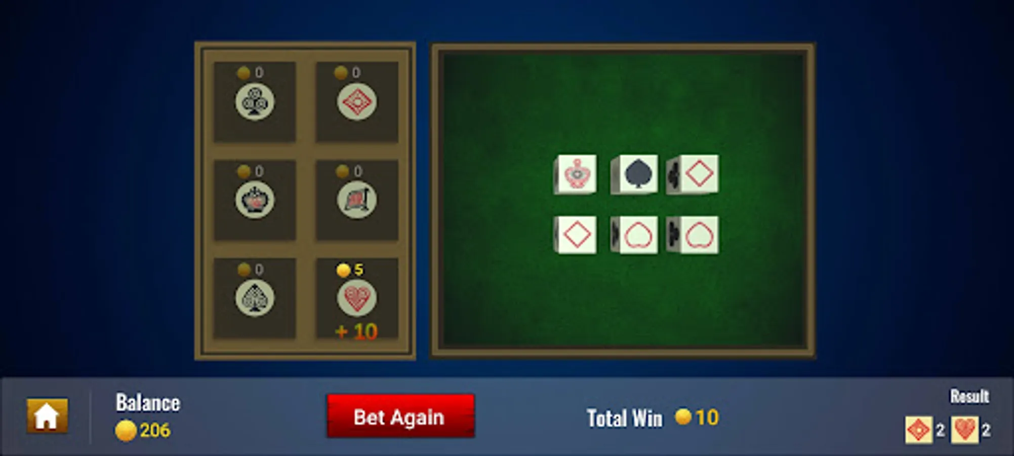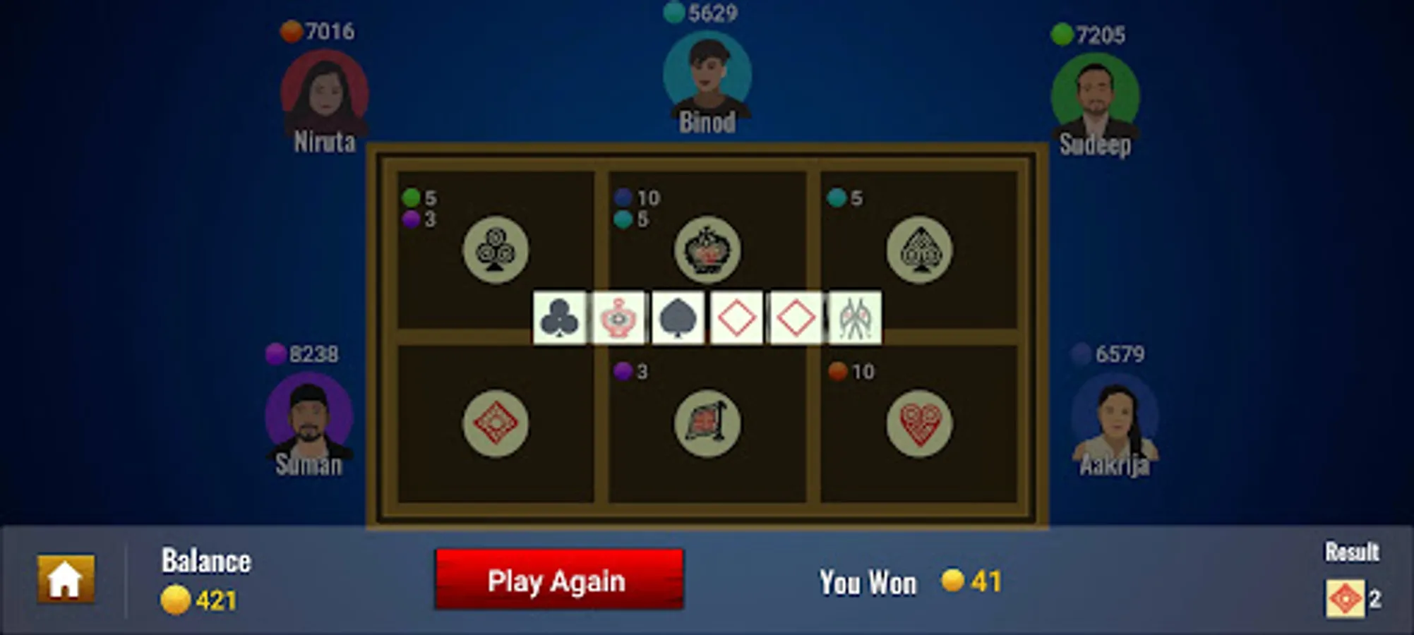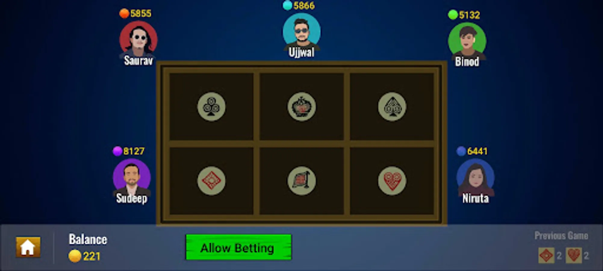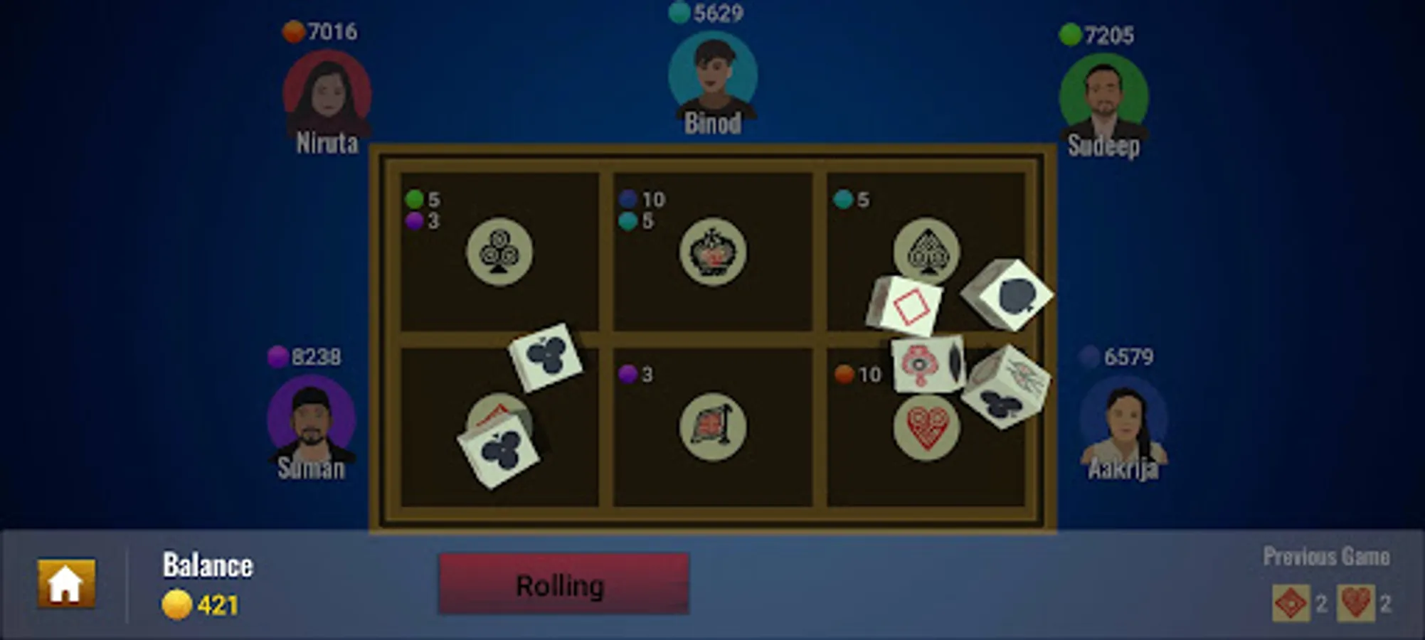 In this game we have symbols "Hear", "Spade", "Diamond", "Club", "Face" and "Flag" printed on the six faces of each dice. Since it is a betting game, a person will host the game and the rest others can place their bets on any of the six symbols. The player will place a bet and the host will roll the dices.