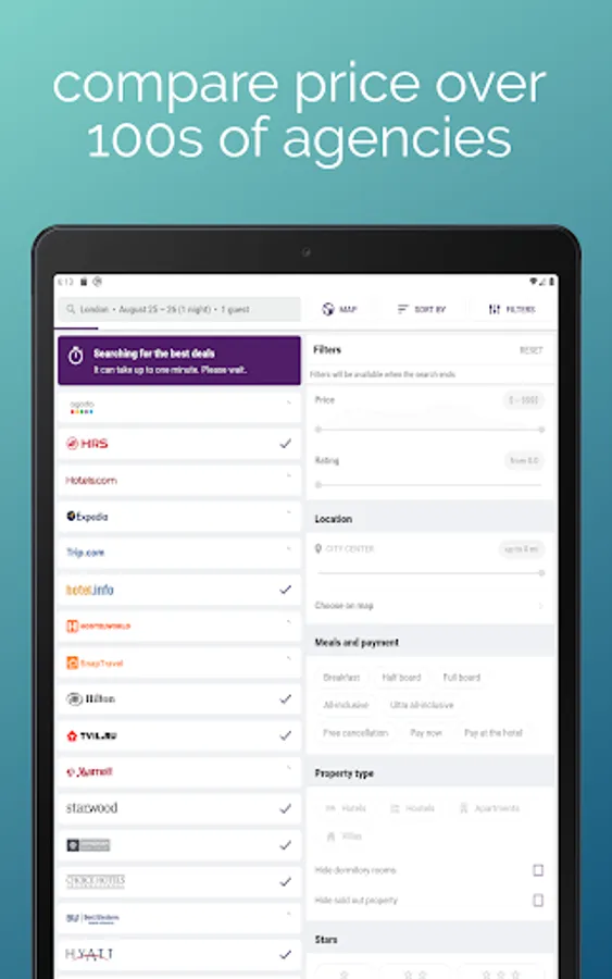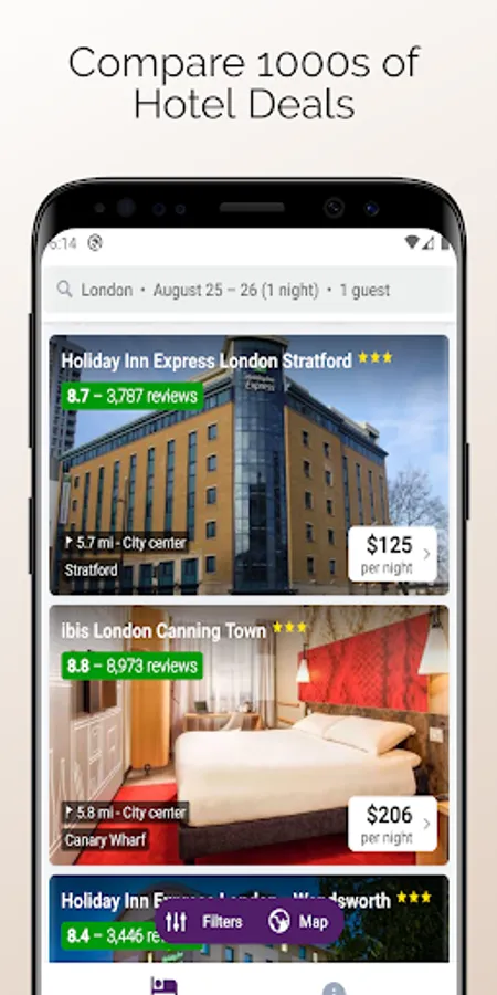 Cheap hotels app provides you with a price comparison system that helps you to search and compare hotel rates from 100s of websites. All types of hotels including cheap hotels, low cost hotels, budget hotels, etc are available in this app. Even in lastminute also app provides best rates lastminute hotels around your location. No matter whatever your budget is you can avail of all types of accommodation according to your need and wish. You can use any currency of your choice to book hotels search. Our app provides information like Hotel location and maps, hotel room availabilities, hotel room booking prices from different websites, hotel descriptions and photos, hotel amenities, customer ratings. and guest reviews. You can search for hotels and book your hotels without any extra charges. You don't have to depend on any travel agencies if you have our app.