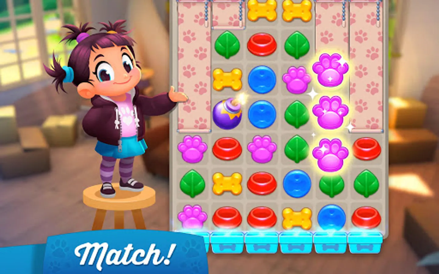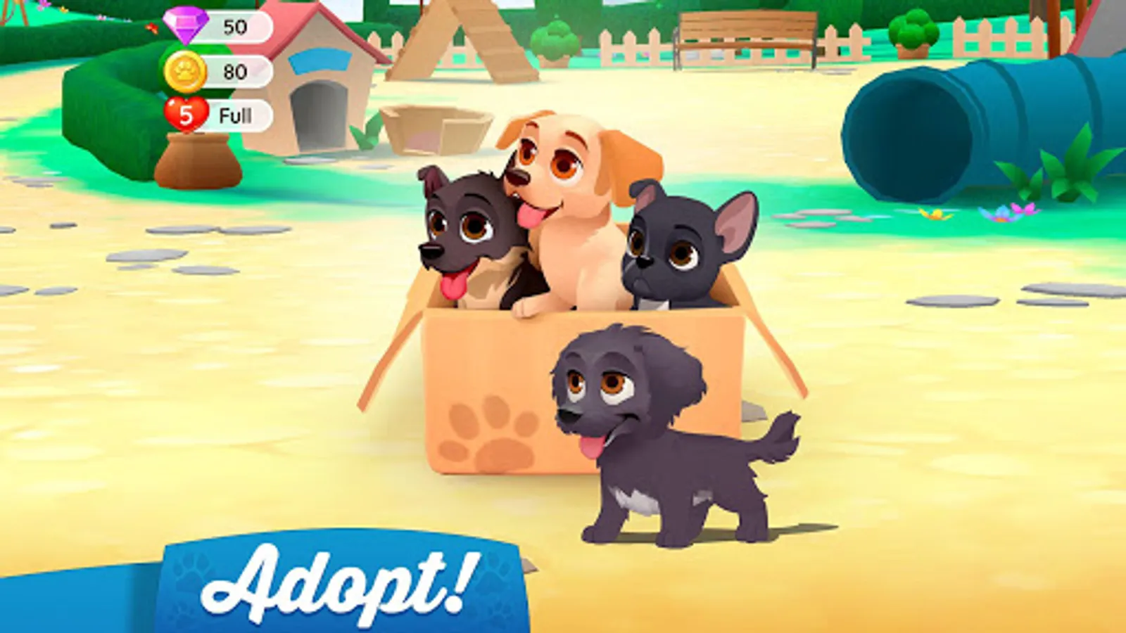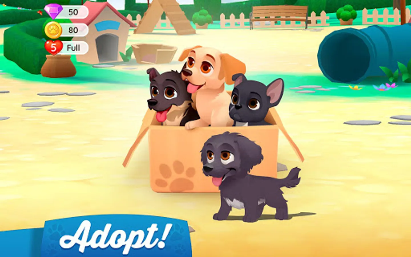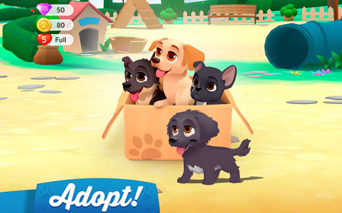 - Solve fun match-3 puzzles and gather coins to adopt dogs and buy decorations.