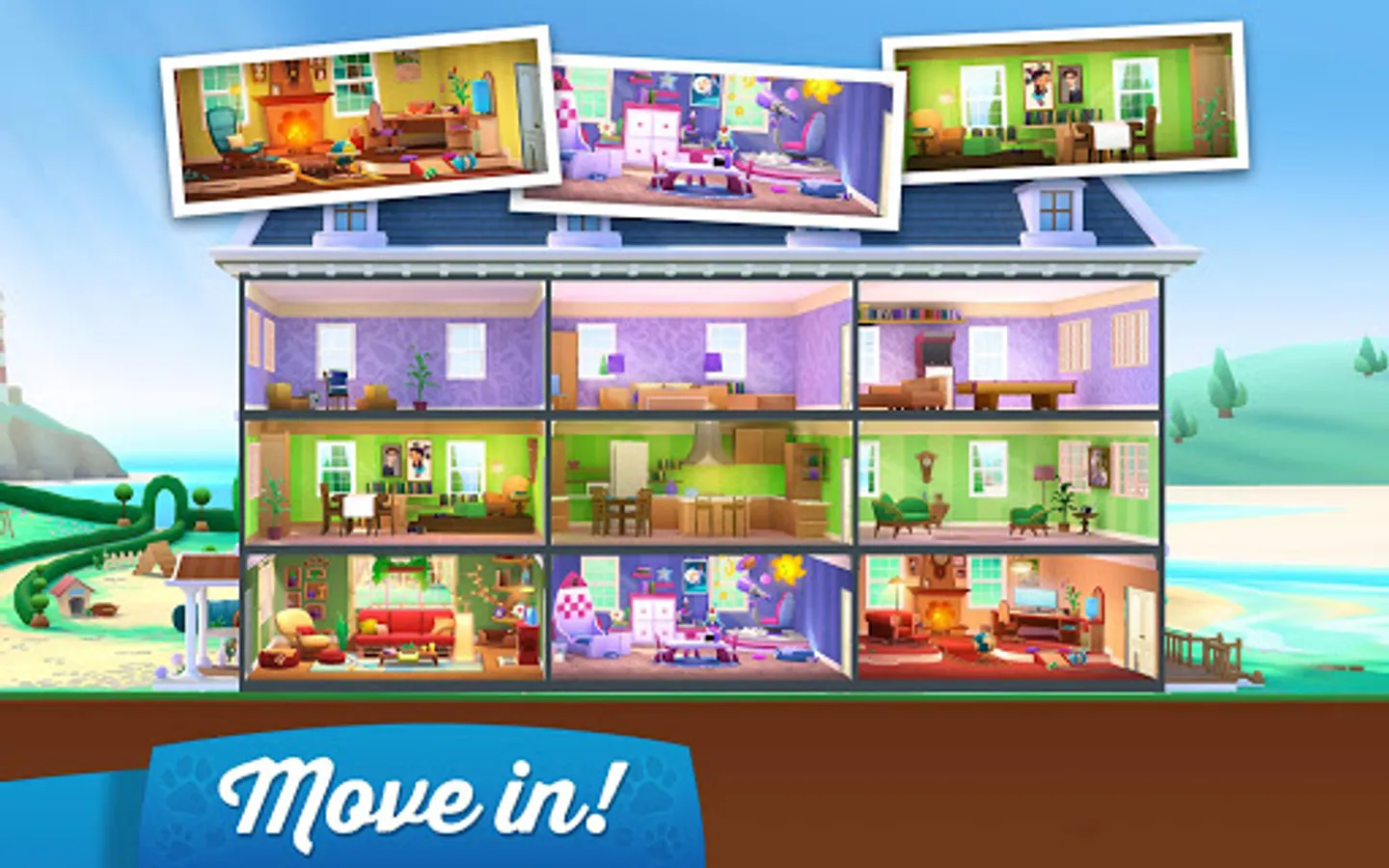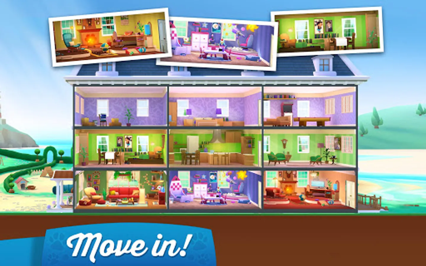 - Step into a gorgeous 3D mansion, unlock its rooms, and decorate them to your taste.
