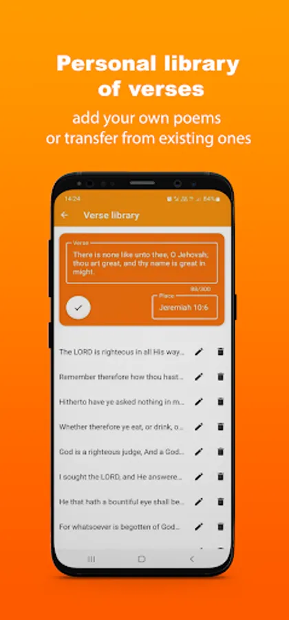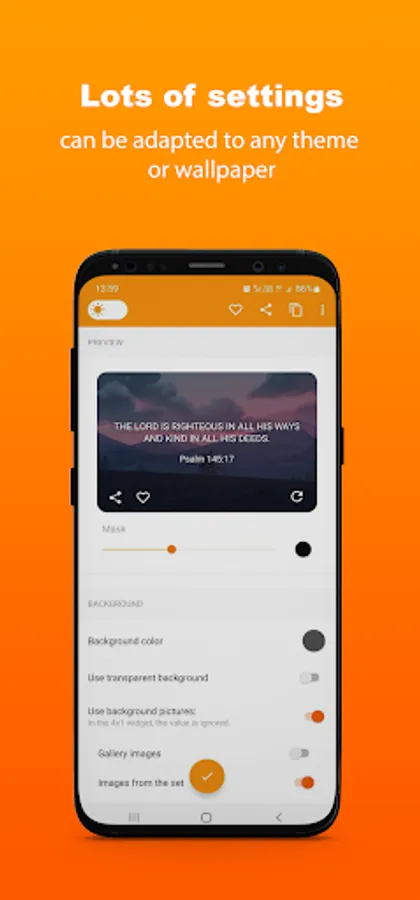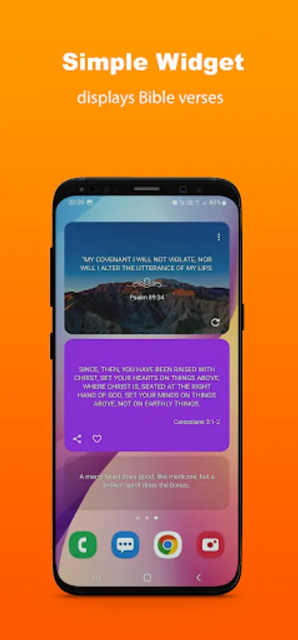 A beautiful widget for displaying verses from the Scriptures. Supports Russian, English, German, French and Spanish translation. Build up and share the Word of God every day! Flexible to configure, it is possible to use beautiful backgrounds, as well as set your favorite color or favorite photo from the gallery. You can adjust the color of the text as well as the ability to display on the lock screen and in the notification panel. It is possible to share poems with friends in social networks and see what they share. Texts and backgrounds change independently each day or after a set period of time. This widget will become an integral part of your mobile device and your life. God bless you!