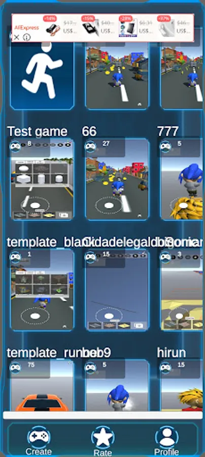You can create endless runner games, third person shooter games, melee games and any other game in 3D. Your created games are published and can be shared with friends. You can also play dozens of games created by other game developers all over the world