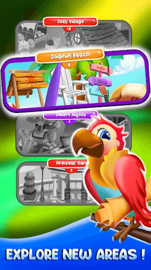 Match the tiles as fast as you can, unlock the areas, help the parrot to travel to different places, and complete the scenes!