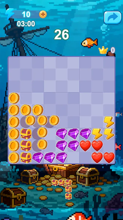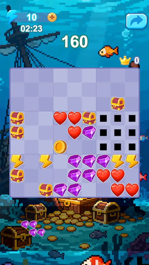 Plunge into pixel underwater chaos! Match sparkly coins, gems, and chests to snag sunken treasure in this zippy, treasure-hunting puzzle romp.