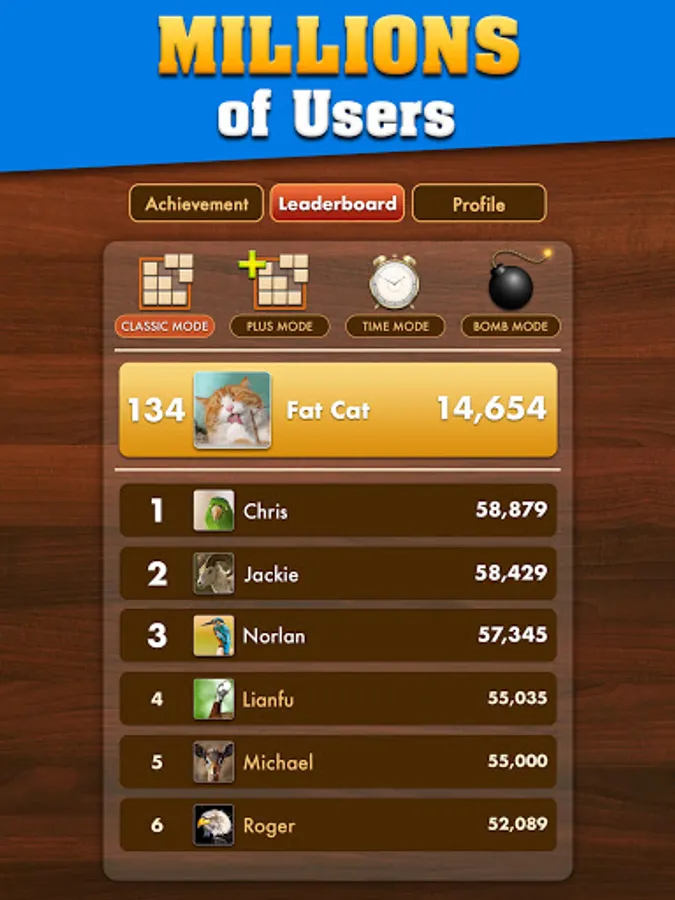 This game is available with 5 Modes: Classic, Time, Bomb, Plus and Adventure. Each mode will bring you different joyful experiences with woody puzzle.