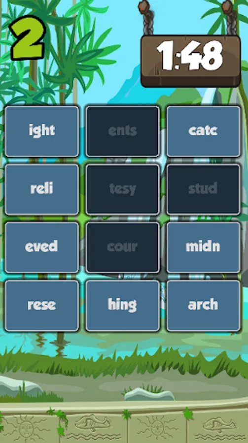 Six eight-letter words are halved and shuffled into a grid. Find a word by tapping on its first half then its second.