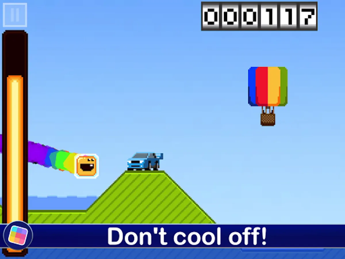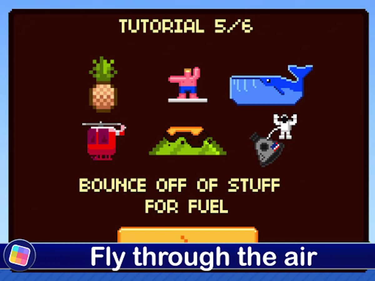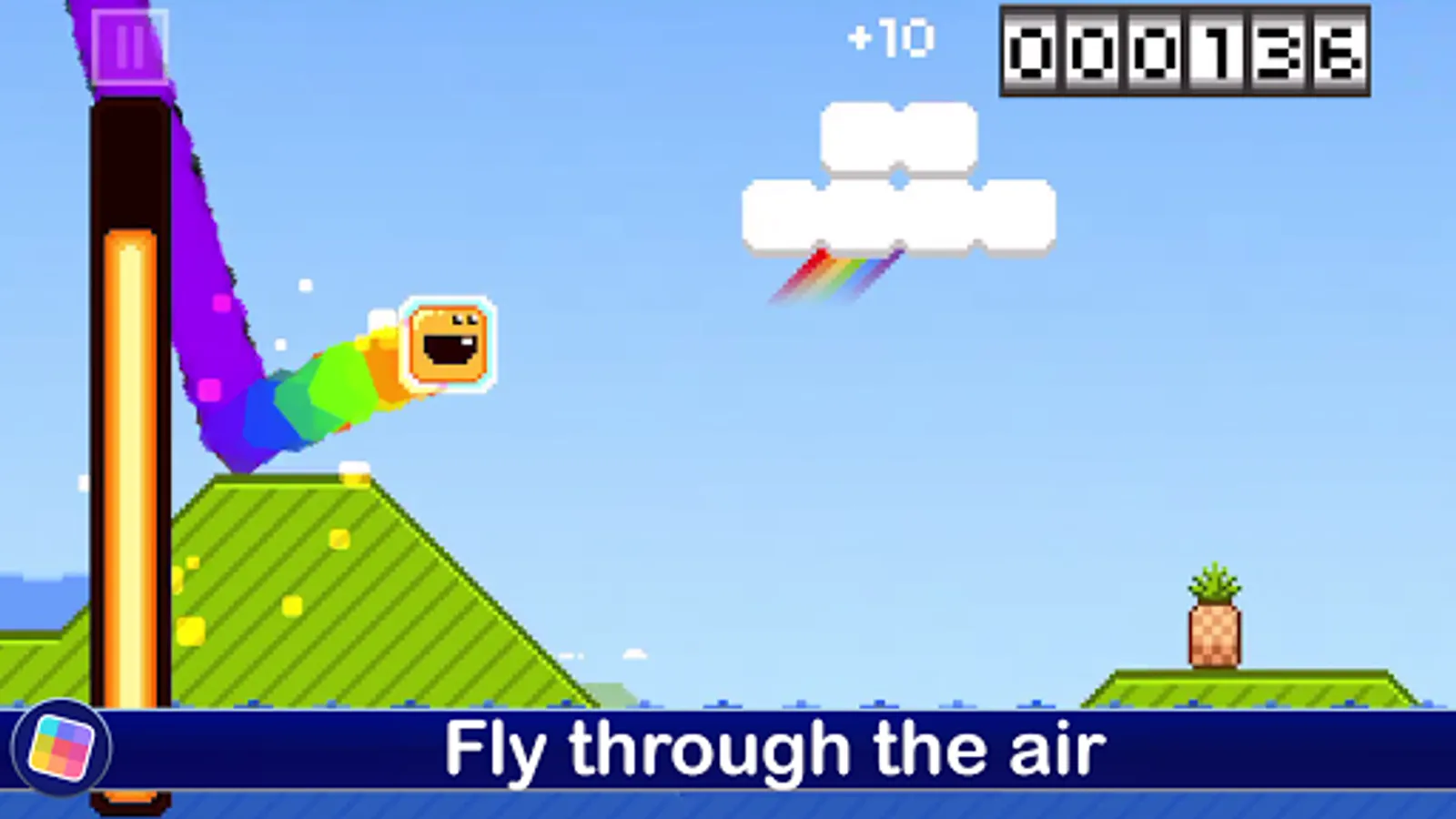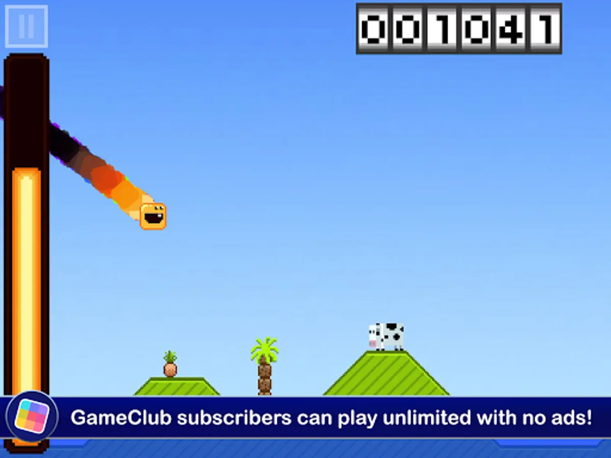 Bounce along a tropical landscape and crash into things to go faster and farther. What kind of things? Pineapples, palm trees, boats, cars, cows, asteroids, even tourists. Especially tourists.