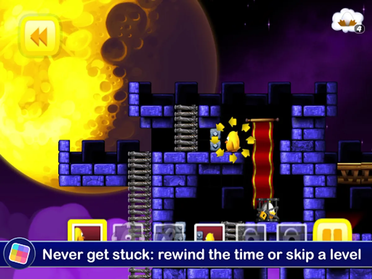 You'll need sharp wits and plenty of creativity to figure out these puzzling stages. Our heroic fowl can build bridges, create crates, freeze enemies, teleport, and more. Each stage offers up a specific set of tools that are the keys to victory. Don't worry if you make a mistake! A simple tap of a button can rewind time and allow you to retrace your steps. Clear all of the normal stages and you'll unlock a variety of bonus stages and ultra-tough hard stages. Are you clever enough to save your family?
