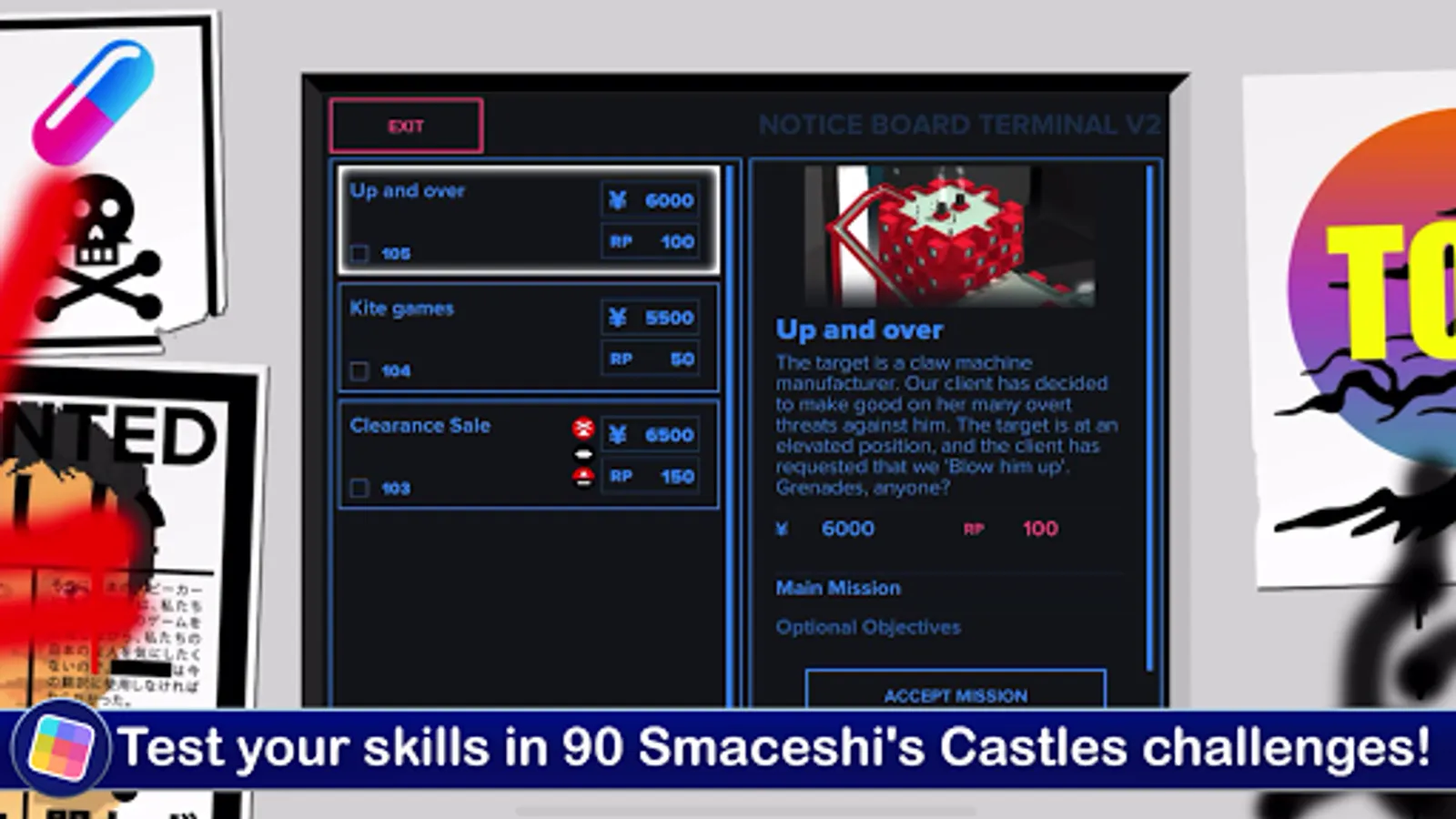 Smaceshi's Castles: In addition to the main campaign, Lord Smaceshi's got a challenge: 90 nefarious tests for the ultimate assassin. From city-chase puzzles to mid-air rocket launcher fights, Smaceshi's Castles will push your stealth, combat, and parkour skills to the limit.