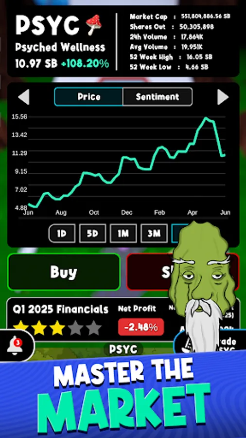 Game the market to accumulate Shroombucks. Buy and hold stock in companies like Psyched Wellness and Heroic Doses to become a Shroombuck billionaire! Use all those sweet gains to buy yourself some furniture, or maybe a fancy new house!