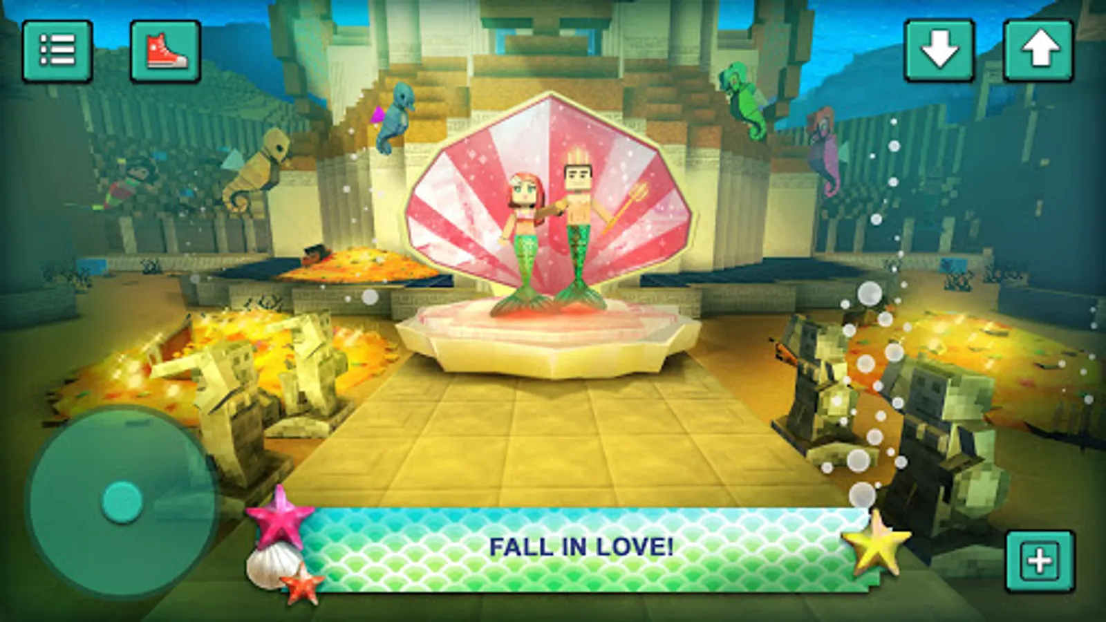 As a mermaid princess you need a glamour look! Dress up and visit a mermaid hair salon. Meet with other mermaid friends or find a blocky pocket pet. Chat with many sea animals like a bass fish, salmon fish, whale, sea horse, sea turtle, shark, octopus or jellyfish. They love to spend time with their mermaid princess! It’s not some kind of ocean animal games, but still feels like a sea safari! During your sea adventure you meet a handsome triton prince as well… Have you ever seen a mermaid in love? Now you can, because in Mermaid Craft you can have a boyfriend and go on dates like in real dating simulator! Love on the sea!