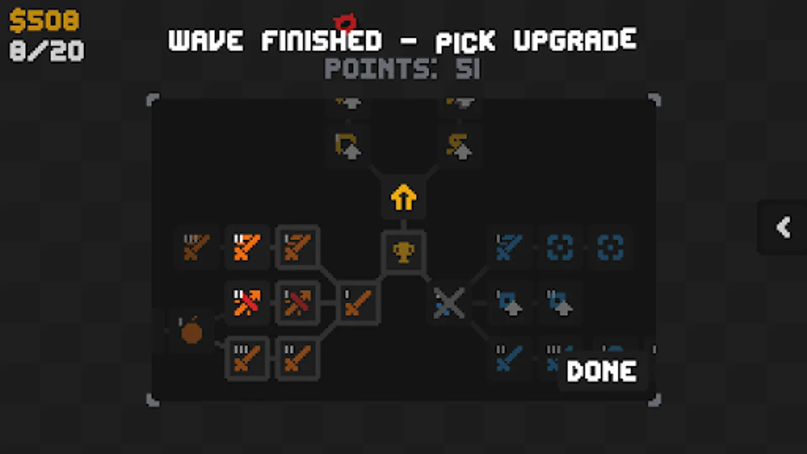 After finishing a wave, you may pick an upgrade to buff your turrets, choose wisely! Going for the Shooter path blocks you from following the Arcane one.