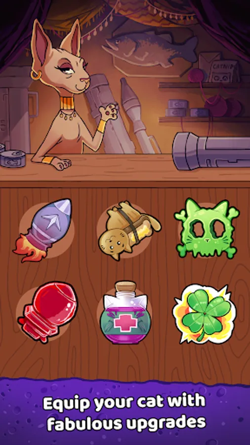 Hunt the monsters down, explore, find your way through obstacles and finish the stages to get worthy prizes! Exchange tasty Goldfish, Silver Cans and other tokens you collect for fabulous equipment and level your cat up to be even more furrious. Upgrade your bazooka, get new enhanced types of rockets and be pawesome! Boom!