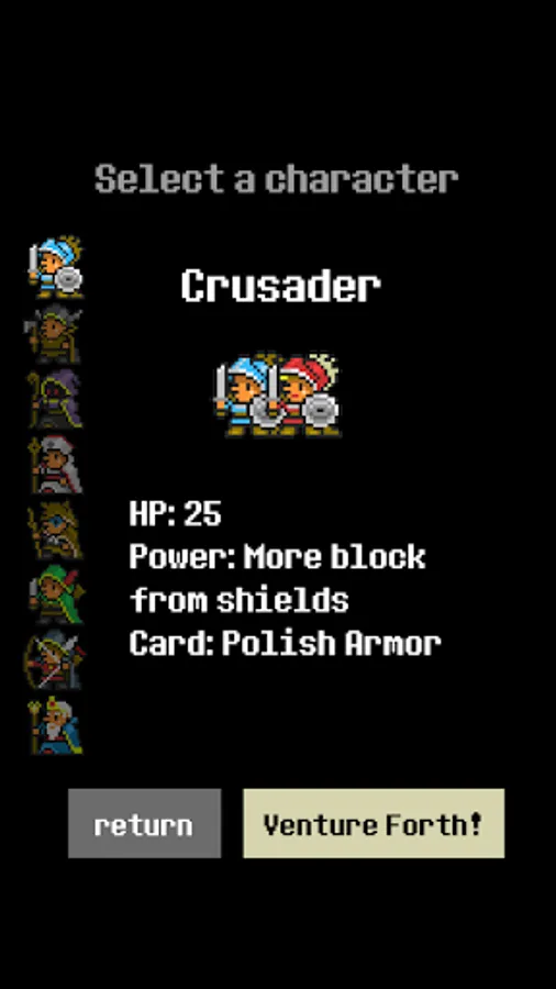 Card Crusade is a roguelike deck building game. Unlock eight different character classes as you explore the ten floors of a winding dungeon. Assemble your deck to unleash unstoppable combos on your enemies. Fight monsters, gain experience, and level up your character to defeat the final boss and become the Card Crusader!