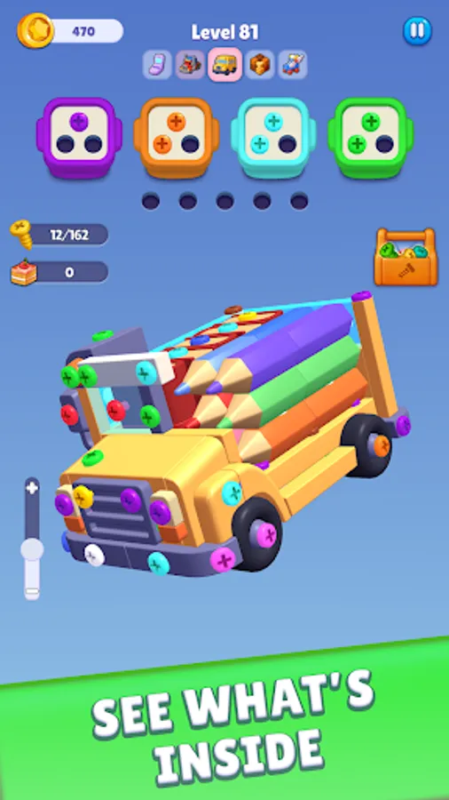 Screw World is a casual 3D screw puzzle game where you dismantle and assemble objects by removing screws in the right order. One wrong move can block the whole structure – think ahead, find the correct path and clear every level!