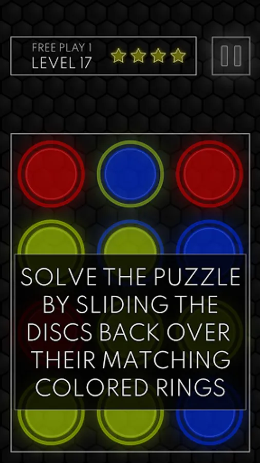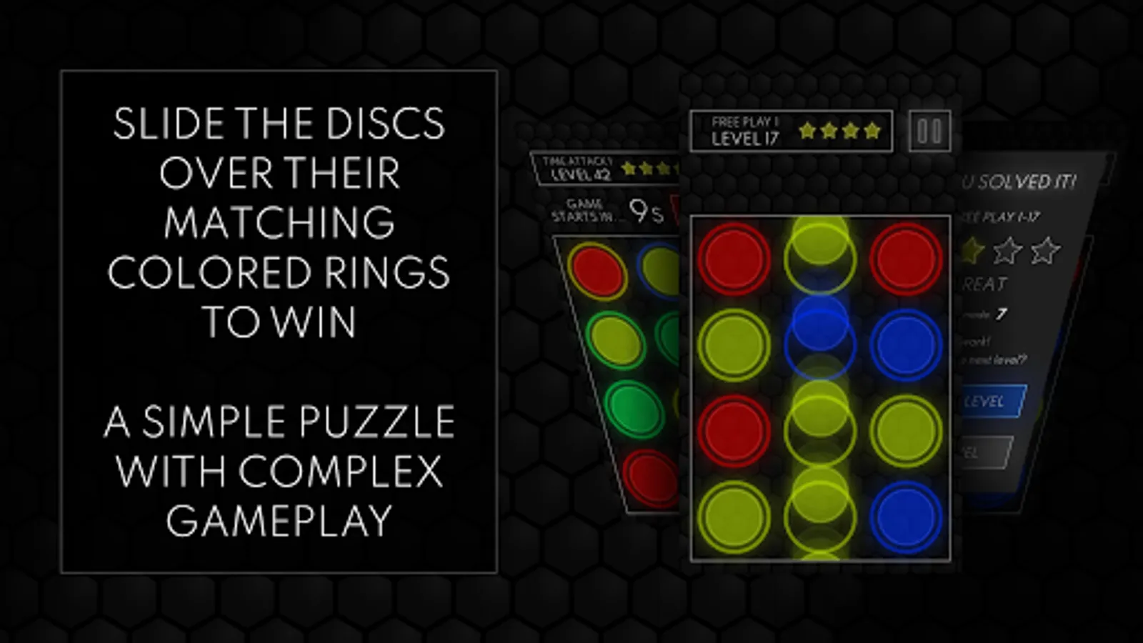 The challenge is to slide the discs back over their matching-coloured rings in the smallest number of moves possible. This starts out as an easy enough task - just moving one piece to the correct place; but as the number of shuffles and colours increases, the puzzles quickly get much more difficult to solve and you’ll need to really exercise your brain in order to find the best solutions.
