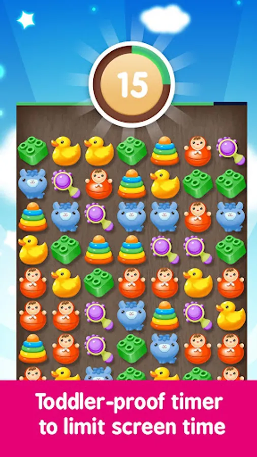 Keep your toddler occupied with a fun match-3 puzzle. No ads. Toddler-proof timer to limit screen time. Tested on developer's own kids. Toddler game is designed for children from three years of age. Bright and colorful, the game attracts baby's attention. Chips are designed in such a way that children want to touch them. And it takes less than 5 minutes to explain the rules of the game to your toddler.