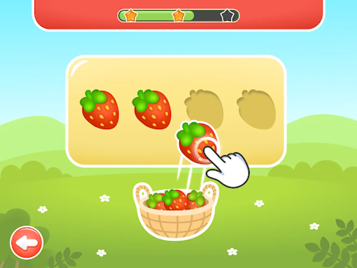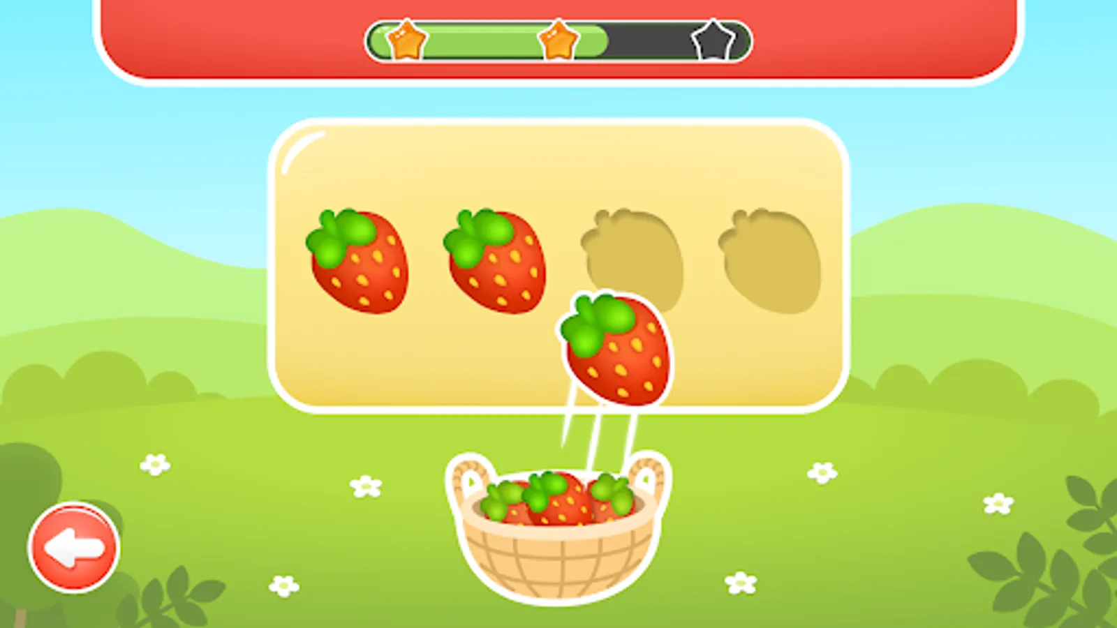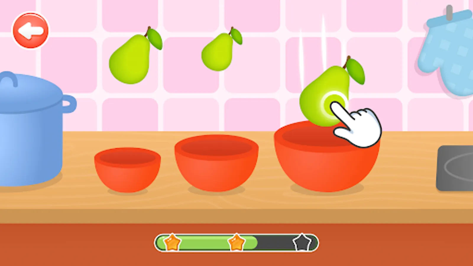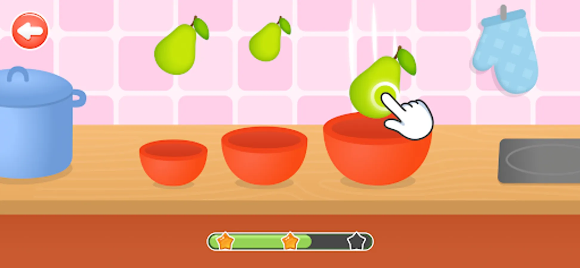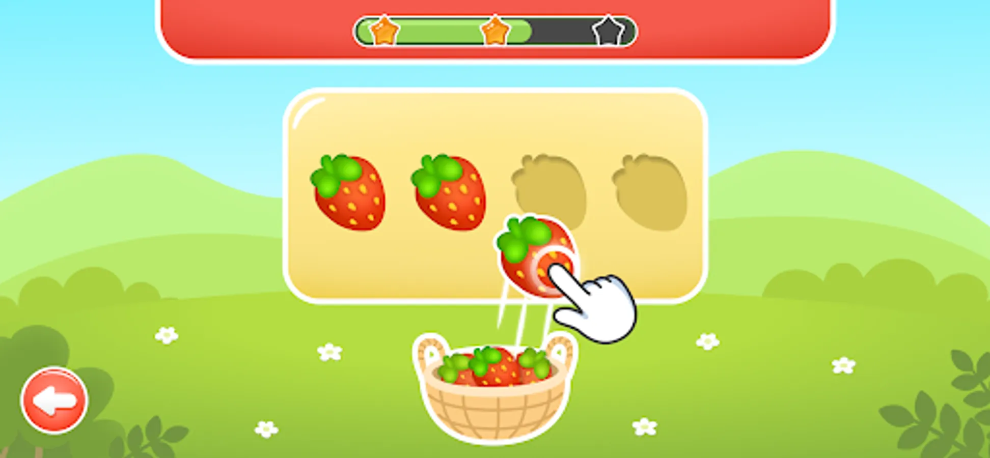 Our kid's learning games are an opportunity to start learning objects and their shapes and colors at 2-3 yo. Put only large items fit in a large basket, and only small items in a small one! Your child can easily learn to distinguish where the apple is big and where it is small, and what color and shape it is.